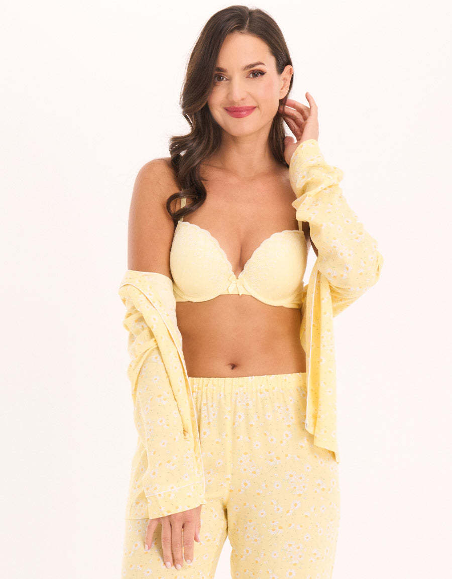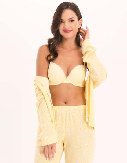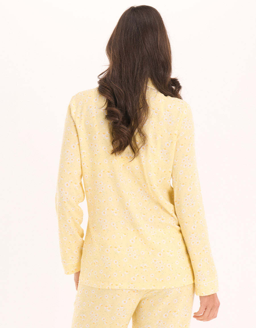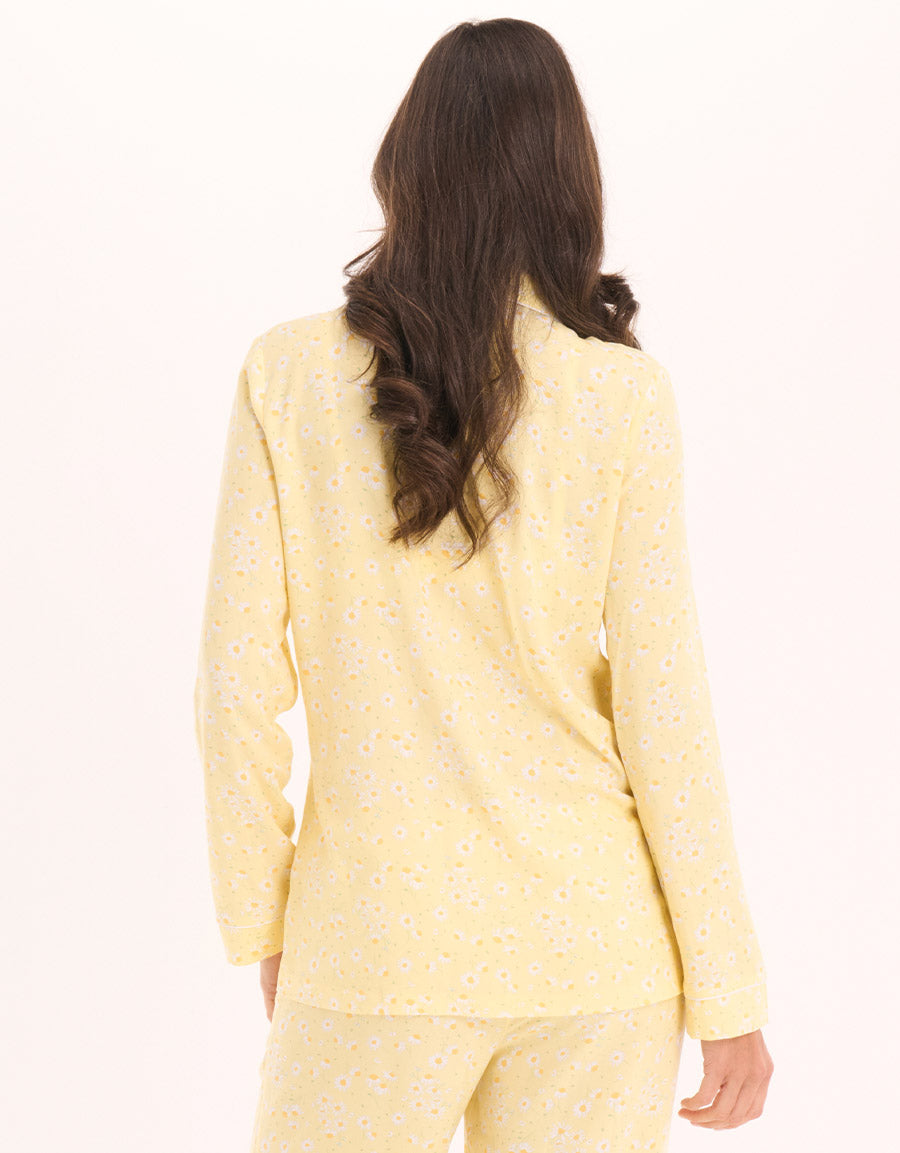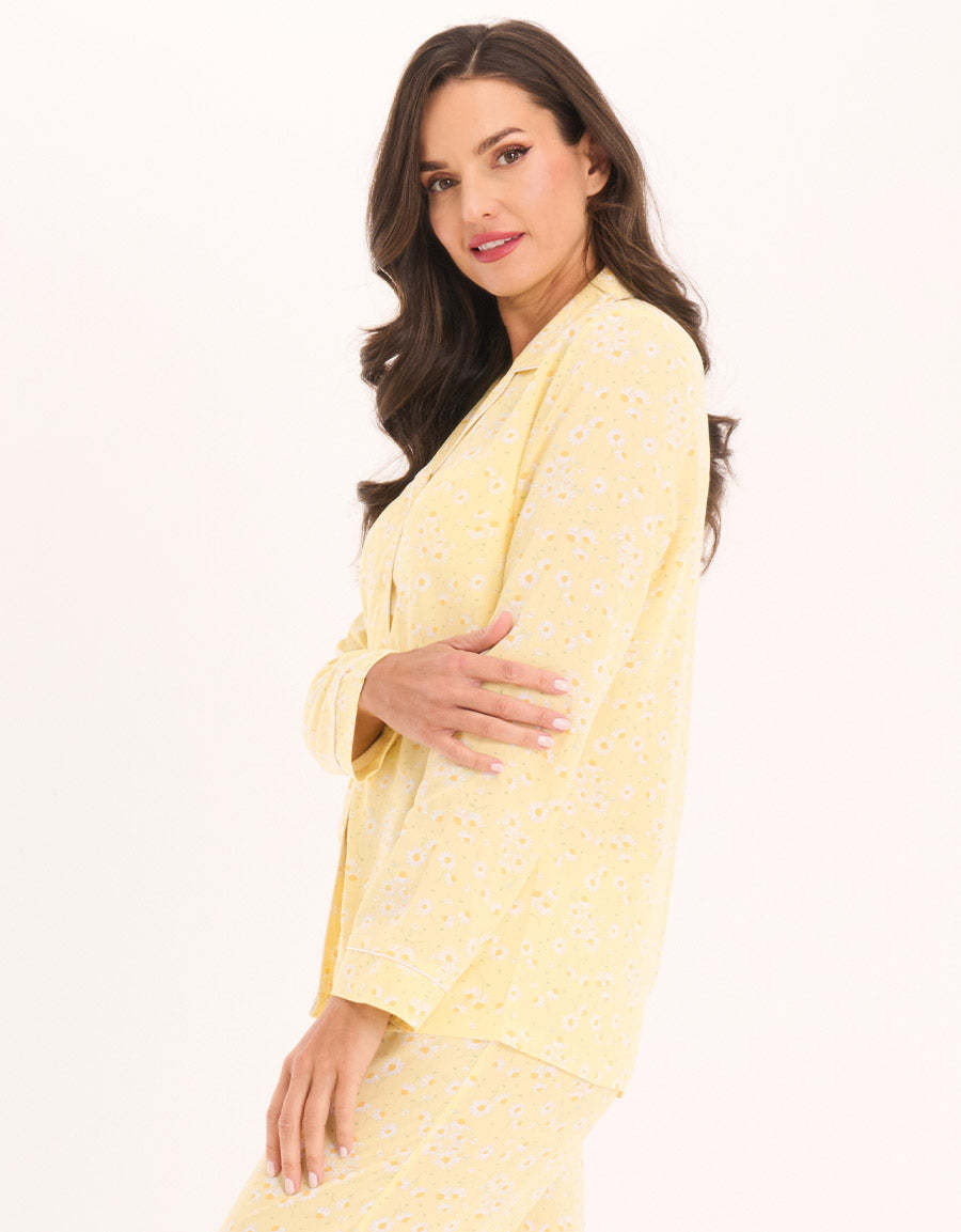 أضيئي مجموعة ملابس نومك مع هذا الطقم الكلاسيكي للبيجاما المزخرف بالزهور. مصنوع من فيسكوز خفيف، يضيف الطباعة باللون الأصفر الفاتح لمسة مرحة وأنثوية إلى روتينك الليلي.