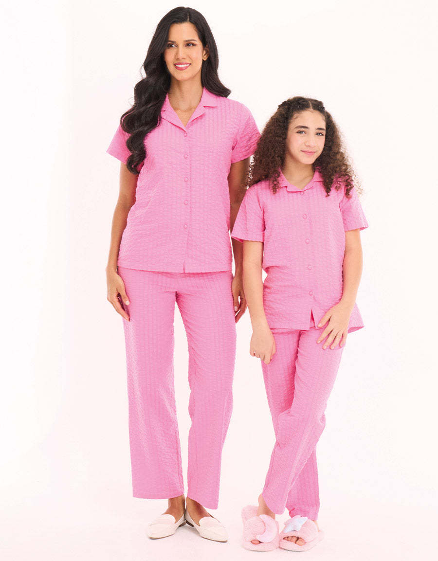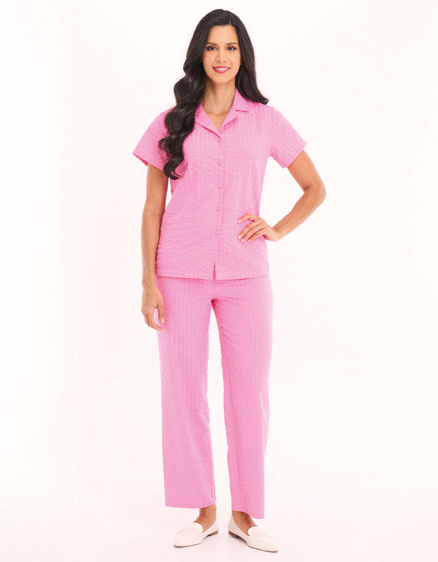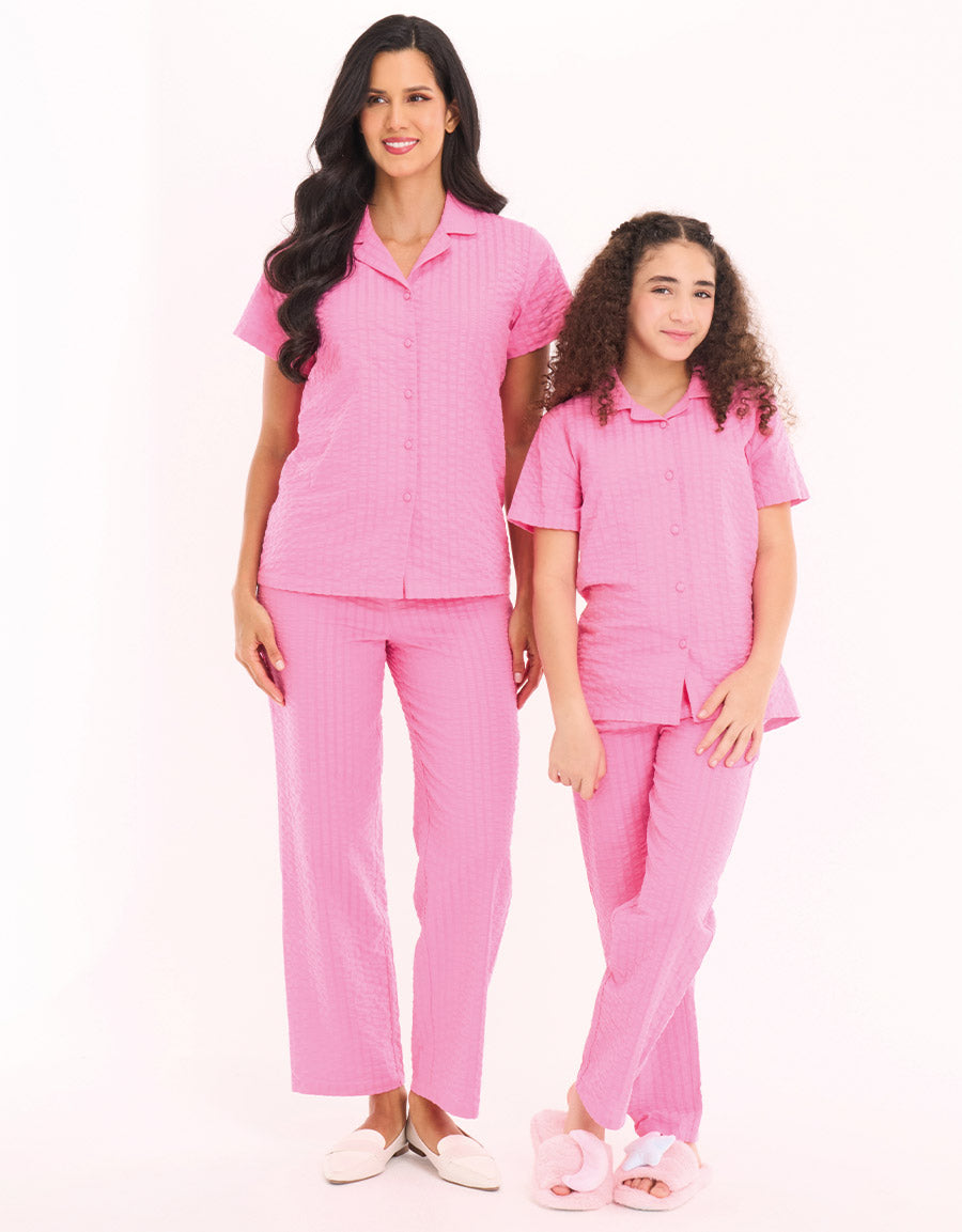 استمتعي بالراحة والأناقة مع هذا الطقم الوردي المزخرف بالزهور. مصنوع من قماش خفيف، فهو ناعم، ومثالي لليالي دافئة، صباحات هادئة، وكل لحظة بينهما.