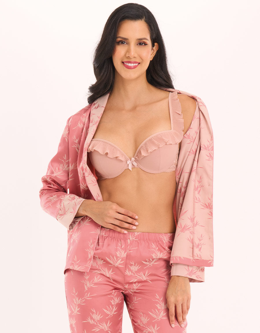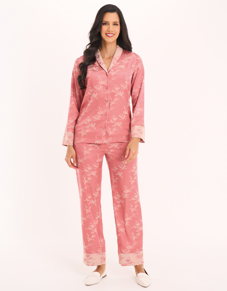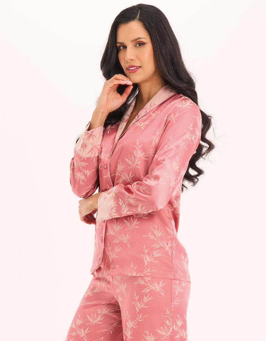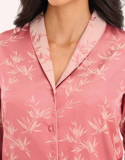 استرخِ بأناقة مع طقم البيجاما المرجاني. مصنوع من ساتان جاكار، يتميز بطبعة زهرية جميلة، ليجمع بين الراحة والأناقة لنوم هادئ.
