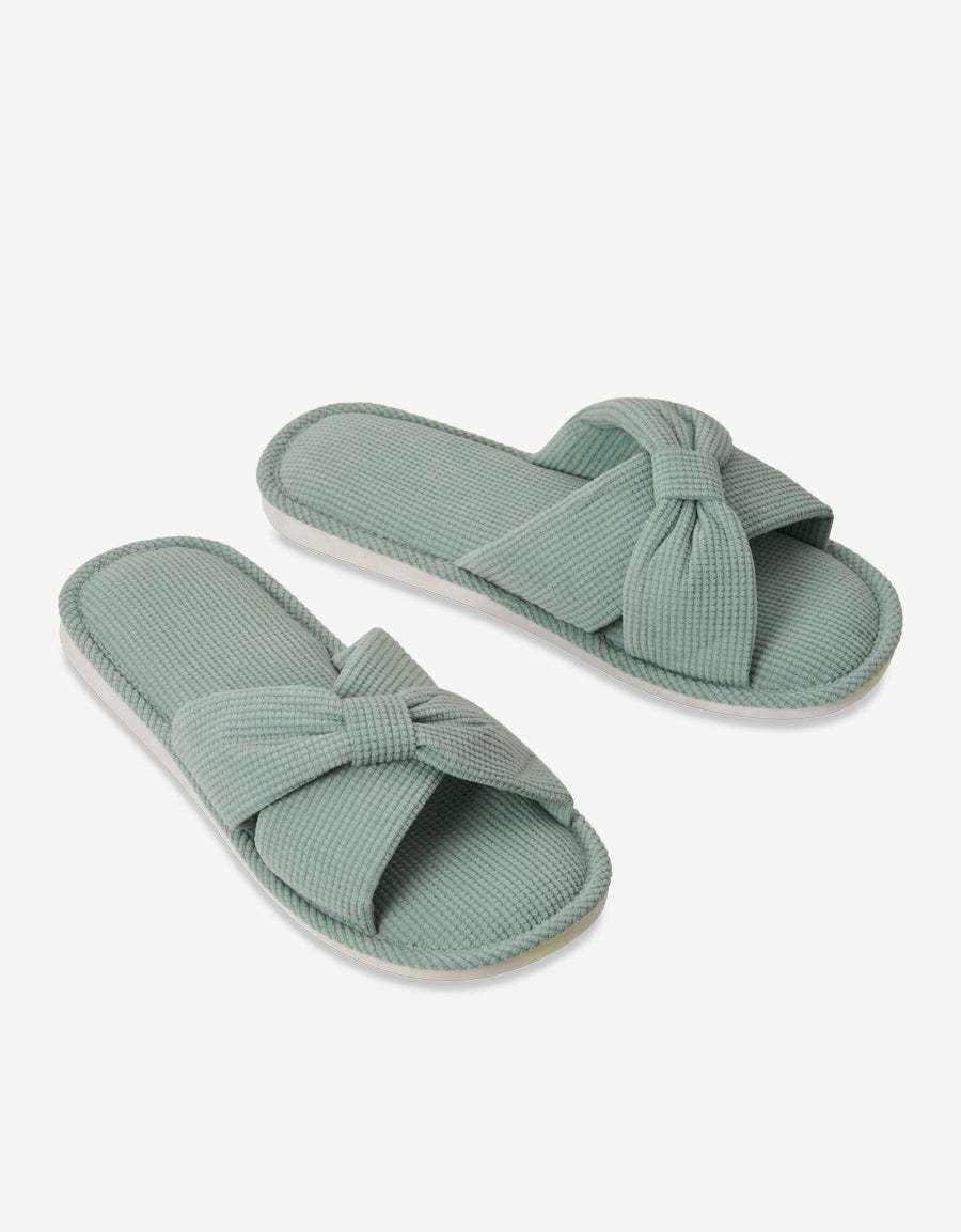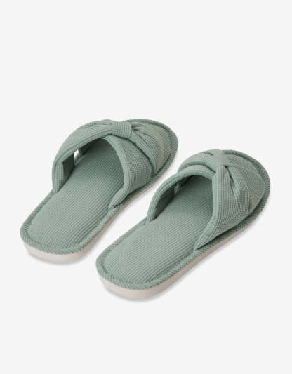 شباشب مفتوحة من الأمام بلون أخضر فاتح، مصنوعة من قماش وافل ناعم لراحة وتنفس مثاليين خلال أيام الاسترخاء في المنزل.