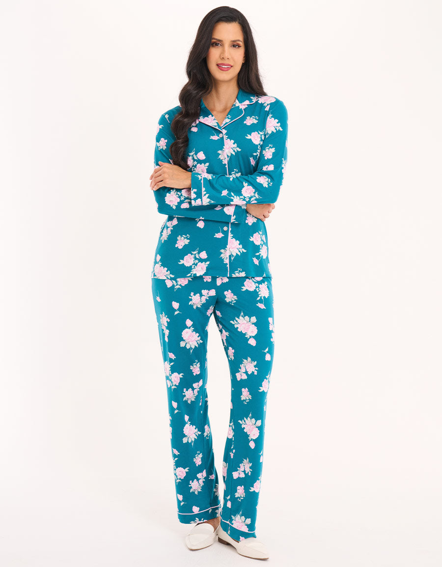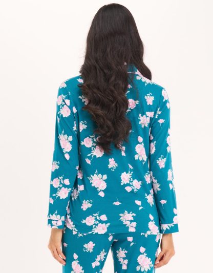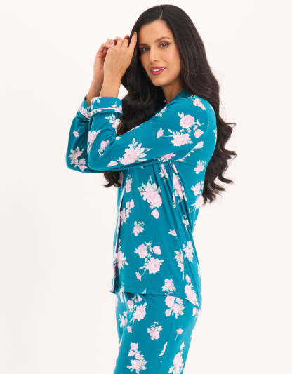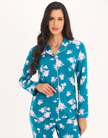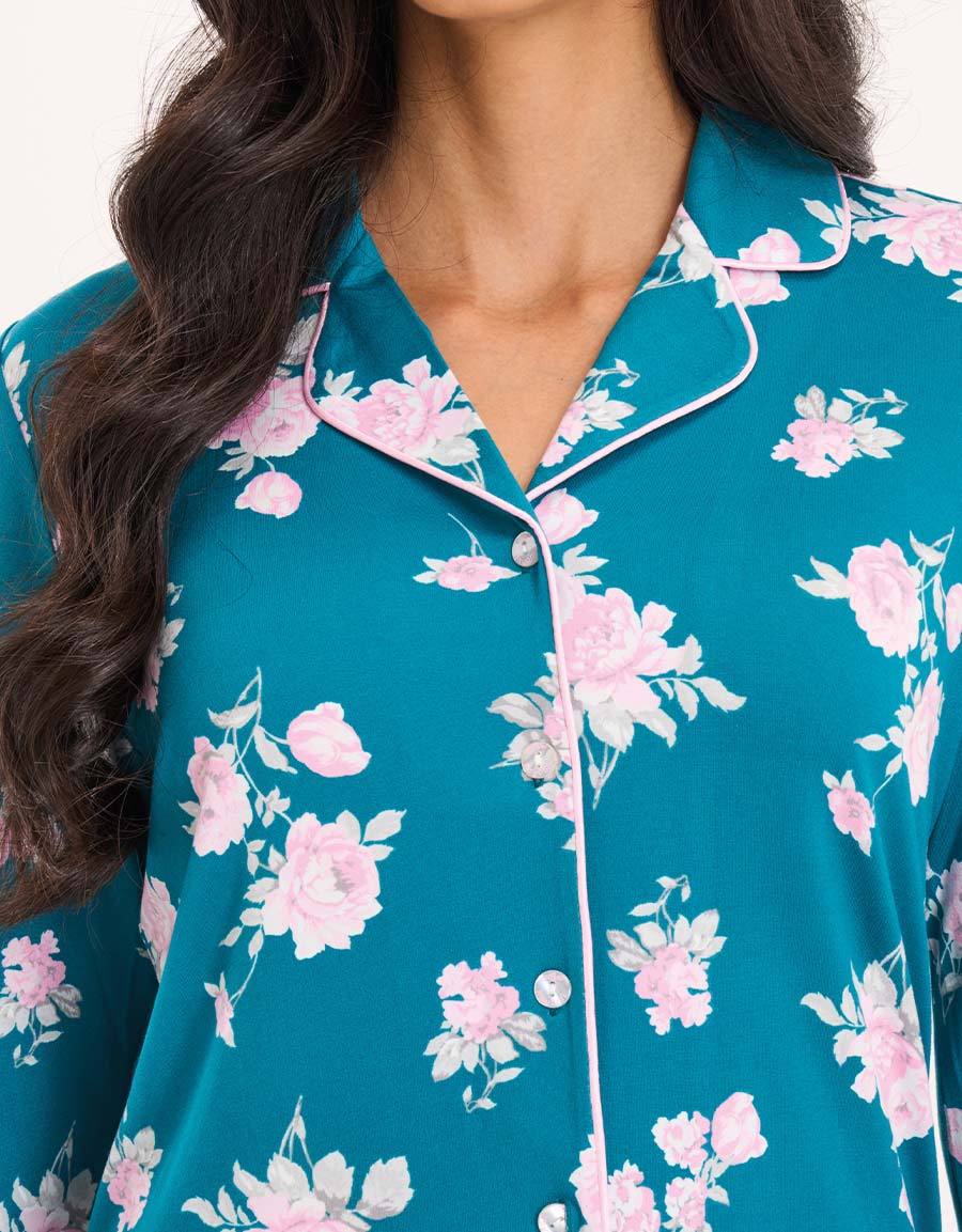 استمتعي بالطقم باللون الأخضر الداكن مع طبعة زهرية رائعة. مصنوع من قماش بوليستر سباندكس ناعم، يوفر هذا الطقم راحة ومرونة لنوم هادئ.