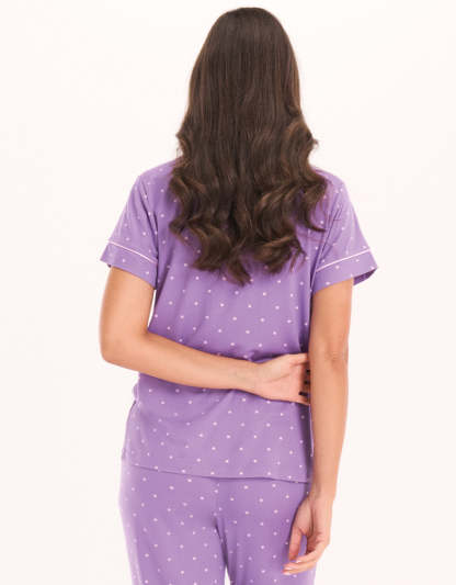 طقم بيجاما بلون بنفسجي متوسط بنقشة النقاط، مصنوع من قماش مطاطي ناعم لمزيج مثالي من الراحة والأناقة.
