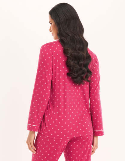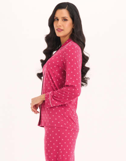 صُمم هذا الطقم من البيجاما الوردية من قماش خفيف مع طبعة زهرية ليمنحك الراحة والنعومة بأسلوب كلاسيكي يناسب خزانة ملابس النوم لديها.