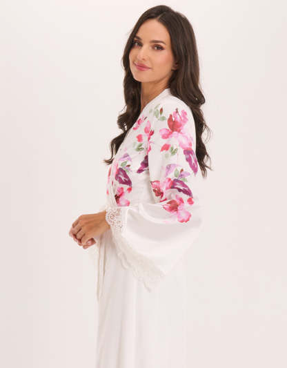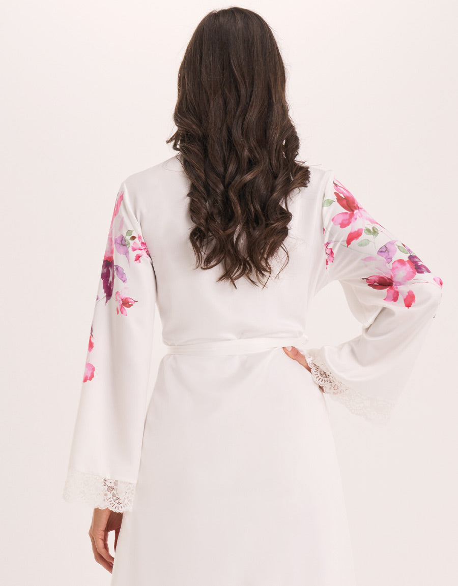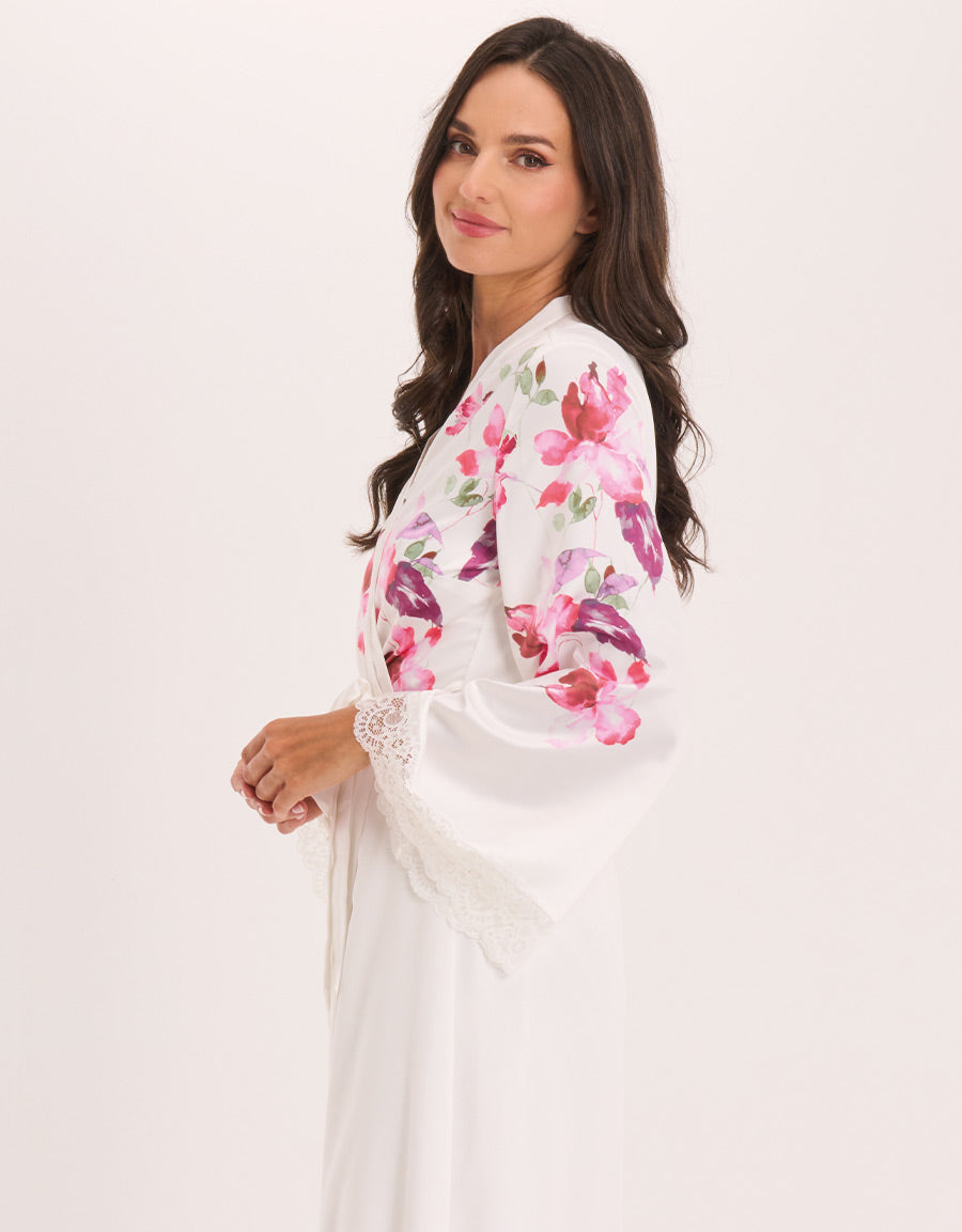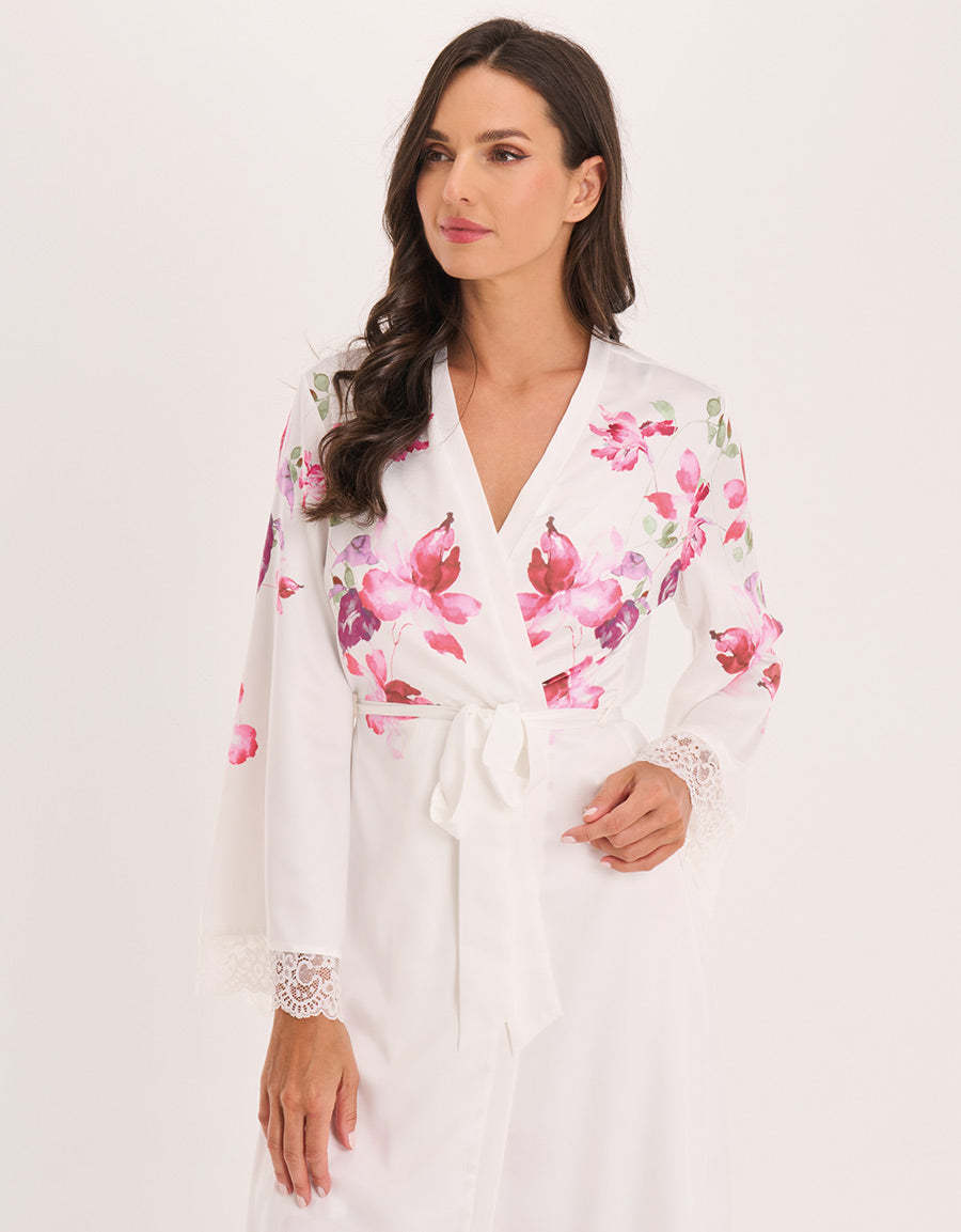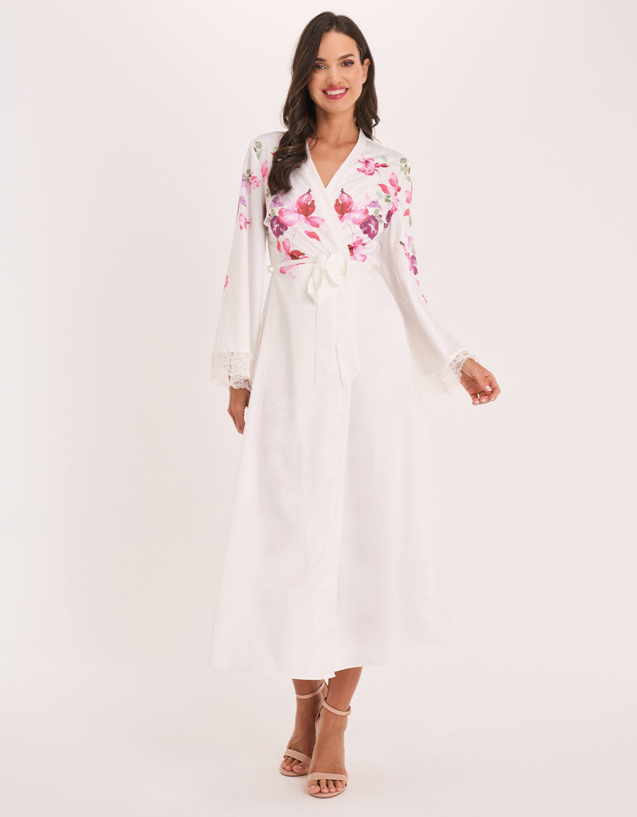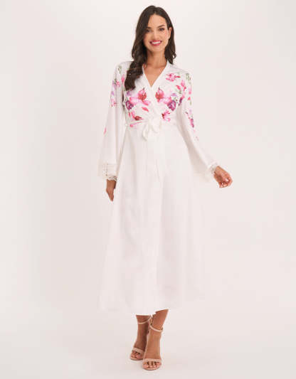 ارتدي هذا الروب الأبيض الطويل والمزين بطبعات أنيقة. مصنوع من الساتان الفاخر، بتصميم انسيابي وطول كامل ليضفي لمسة من الفخامة الكلاسيكية على أمسياتك.