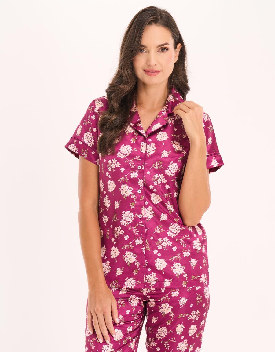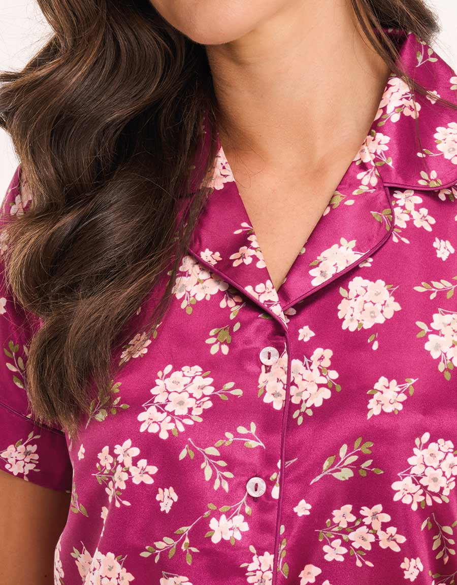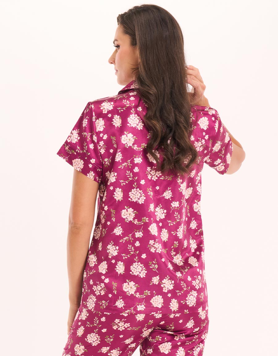 أنيق ومريح، يُصنع طقم البيجاما هذا باللون الأرجواني الداكن من الساتان ويتميز بطبعة زهرية جميلة. يضمن ملمسه الناعم نوم أنيق، بينما تضيف التصميم لمسة رقي.