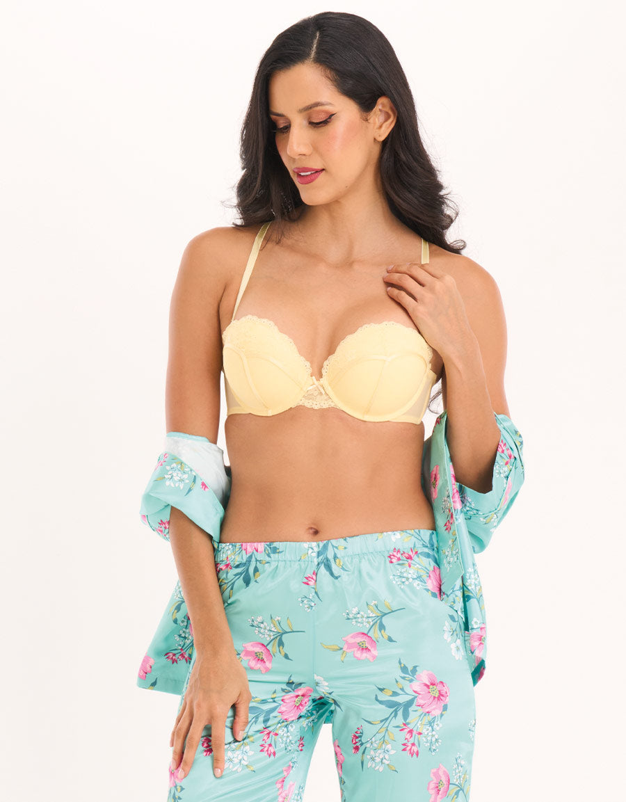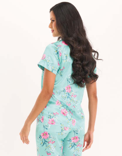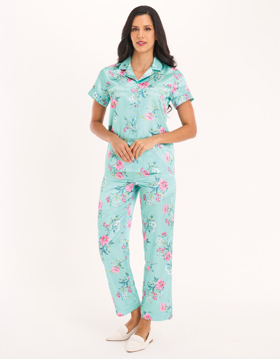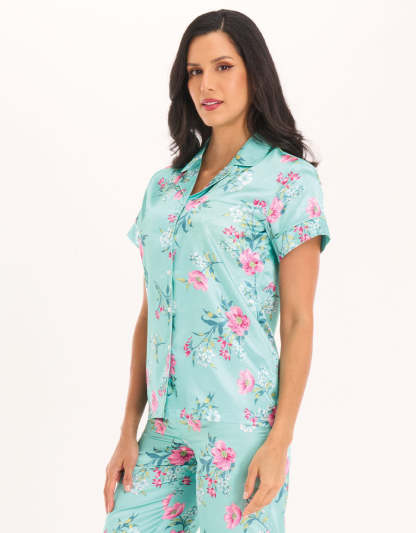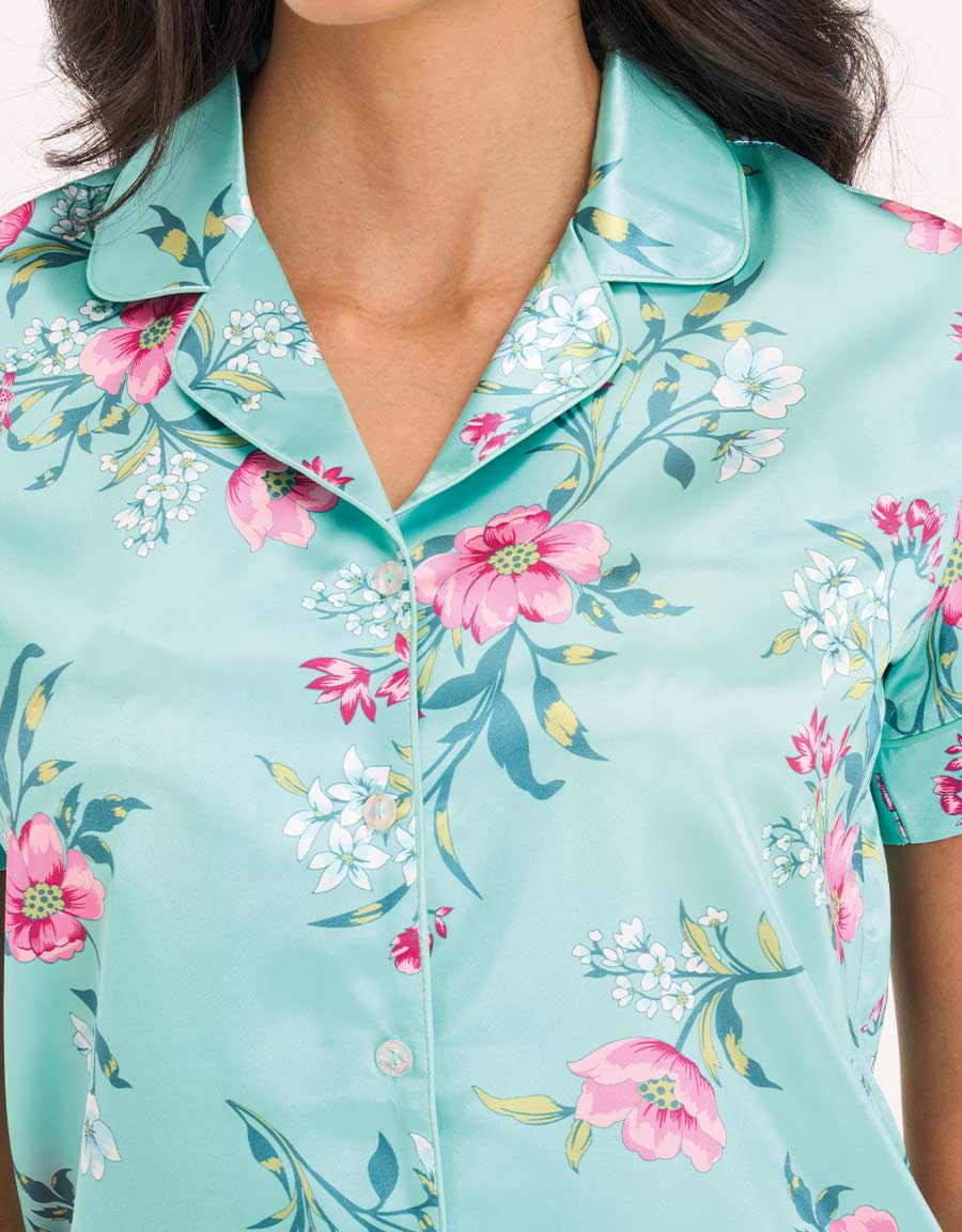 استمتعي بالليالي الحالمة مع هذا الطقم من الساتان المزخرف بطبعة زهرية ناعمة. اللون الأخضر الفاتح ولمسة الساتان الحريرية تضفي أناقة وراحة على روتينك المسائي.