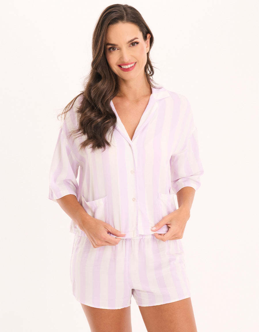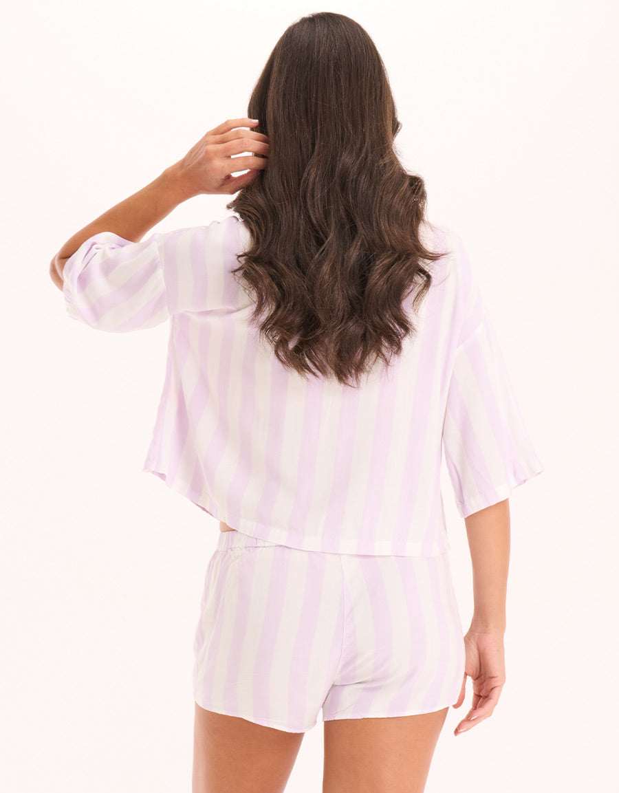 تحدد الخطوط الواضحة والقماش الناعم هذا الطقم المصنوع من بوكسر. تضفي الطبعة البيضاء شعوراً بالانتعاش، بينما يحافظ الفيسكوز الخفيف الوزن على أناقتك وراحتك طوال الليل.