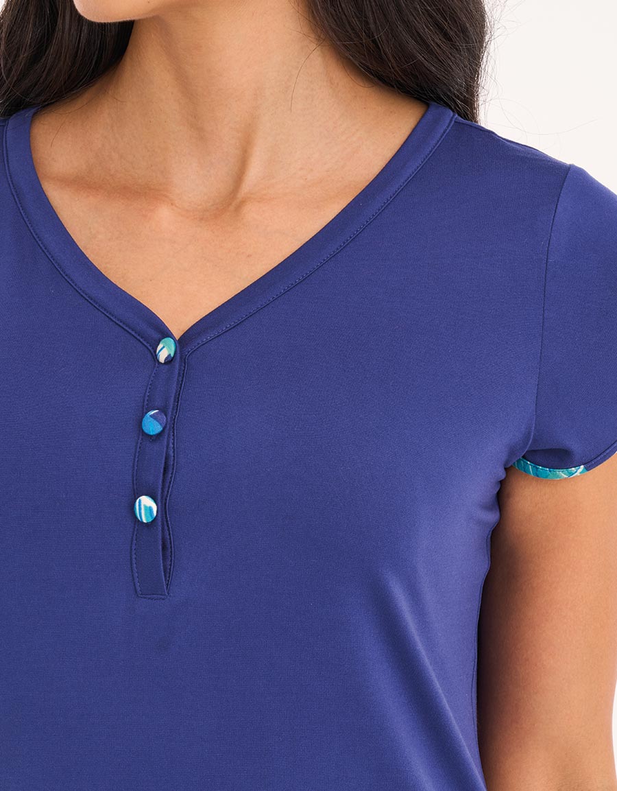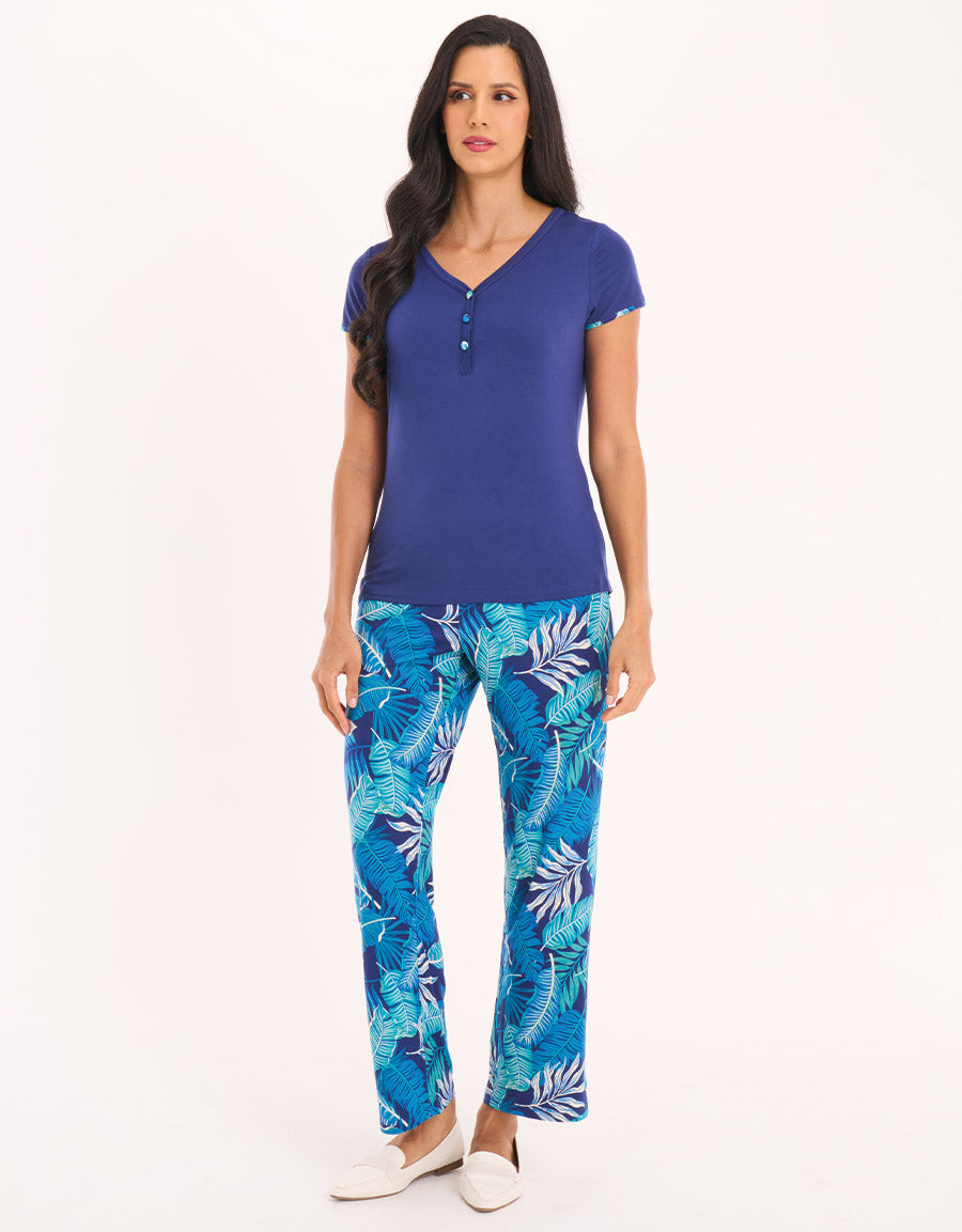 انجرفي بنعومة مع طقم البيجاما بطباعة حيوانية باللون الأزرق الداكن. يحافظ القماش الناعم والمرن على استرخائك بينما تضيف الطبعة الجريئة لمسة حيوية إلى إطلالة النوم.