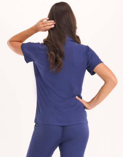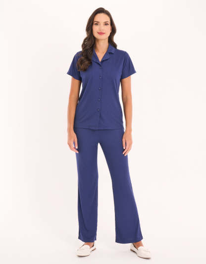 استمتعي بالراحة مع طقم البيجاما باللون الأزرق الداكن. صنع من قماش ناعم، يضمن هذا التصميم البسيط اطلالة محكمة، ليكون الخيار المثالي للنوم المريح والاسترخاء اليومي.