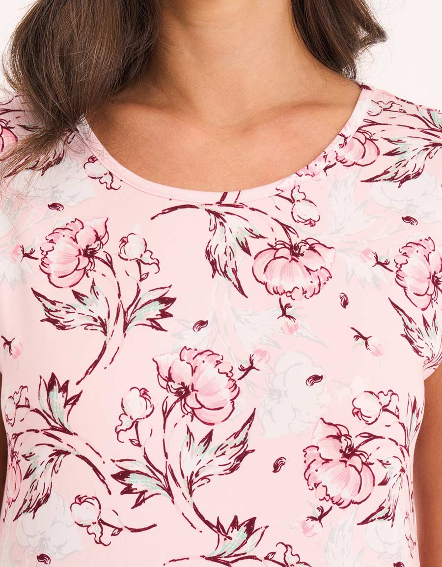تقدم هذه القمصان النوم من الجيرسيه راحة ناعمة وخفيفة. يتميز أحدها بطبعة زهرية رومانسية، بينما يأتي الآخر بلون عنابي مع تطريز زهري على الصدر—مثالي للاسترخاء.