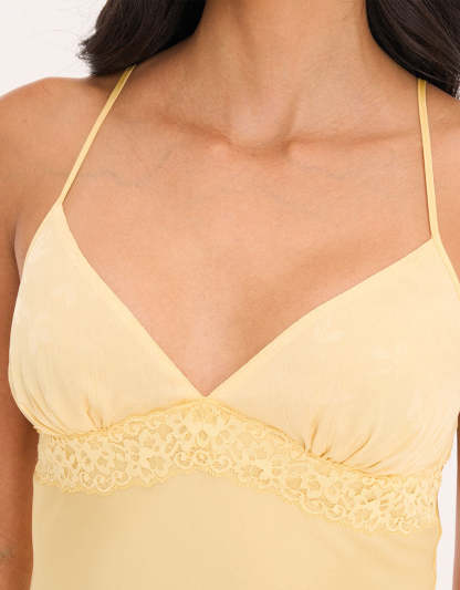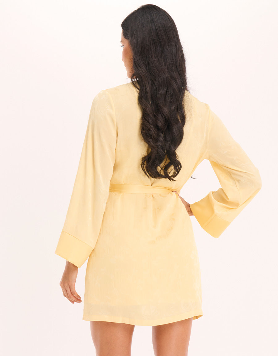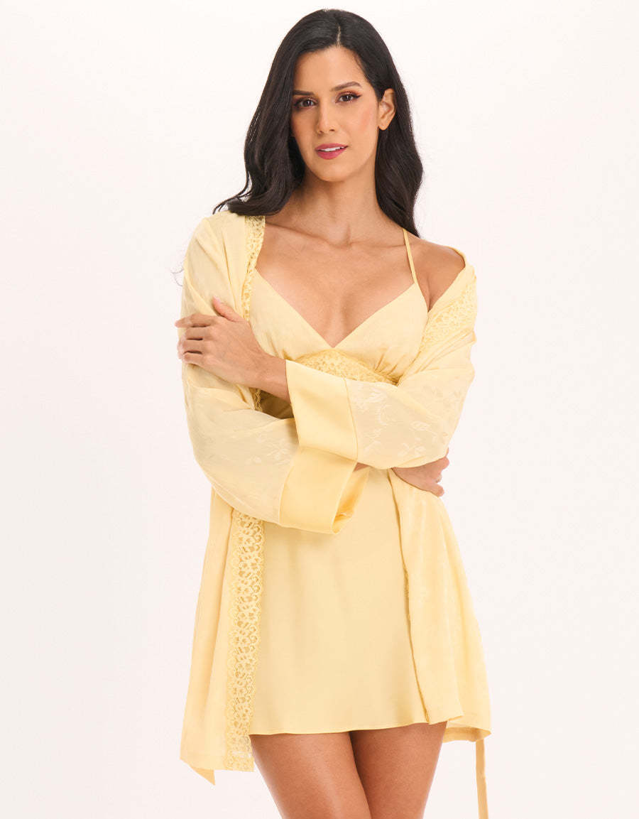 أضيئي أمسياتك بطقم قميص النوم القصير من شيفون الجاكار بلون أصفر متوسط. بتفاصيل زهرية ناعمة، يضم روب وقميص نوم قصير لإطلالة مكتملة.