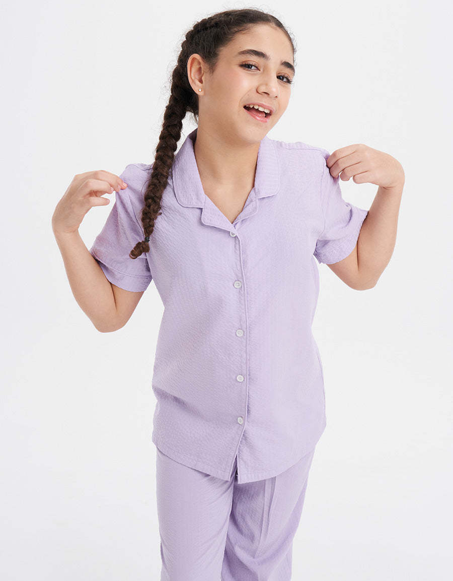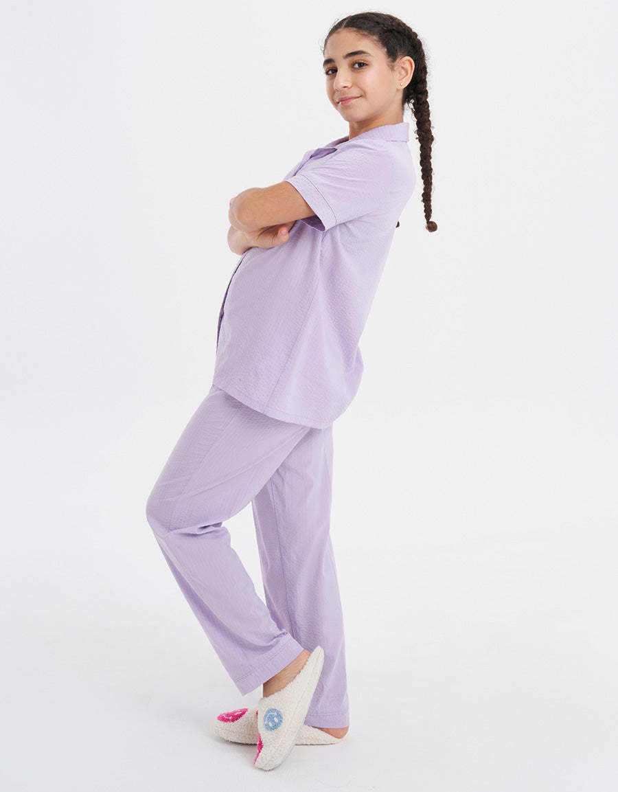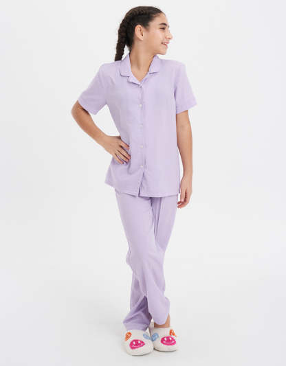 ناعم وأنيق، هذا الطقم البيجاما باللون البنفسجي يوفر اطلالة مريحة لضمان نوم هادئ ومريح طوال الليل.