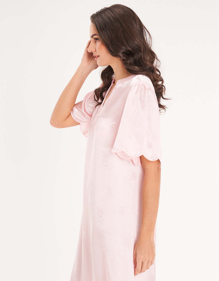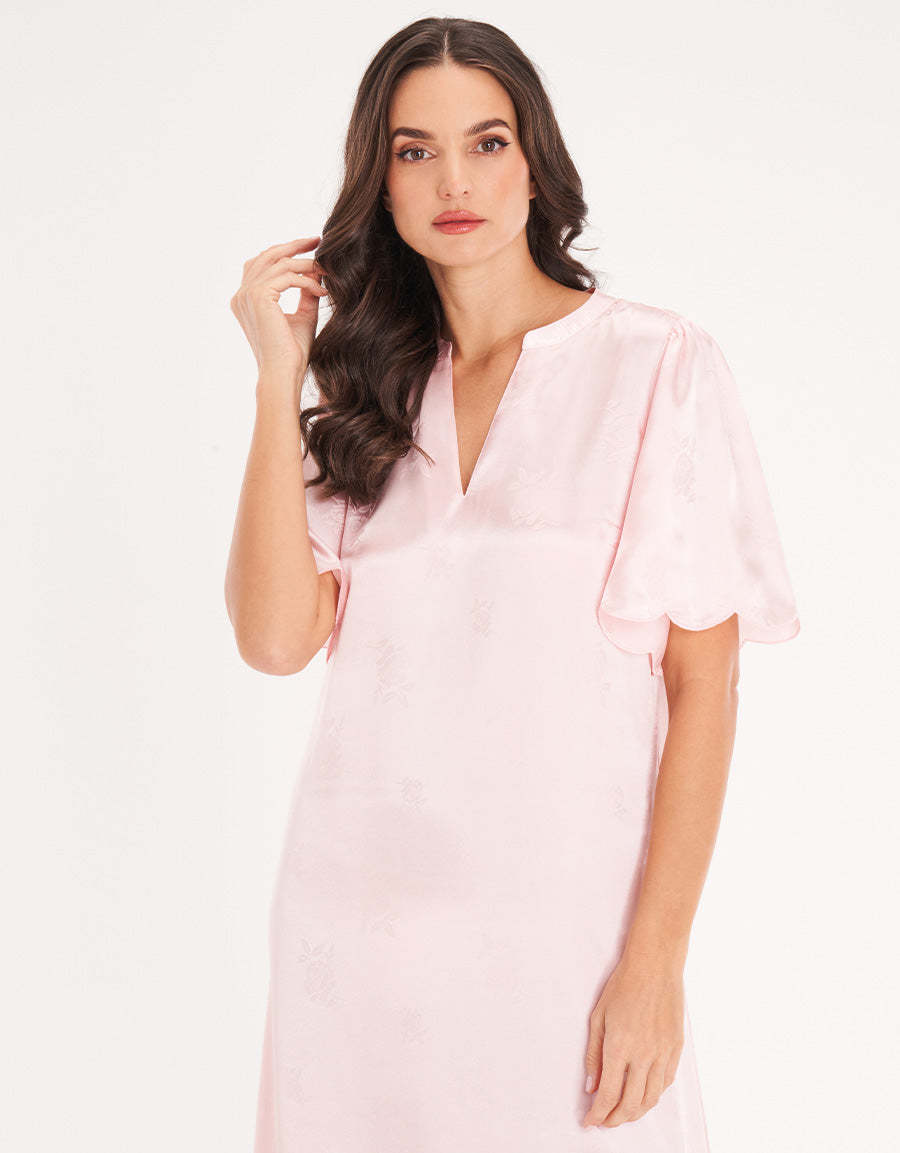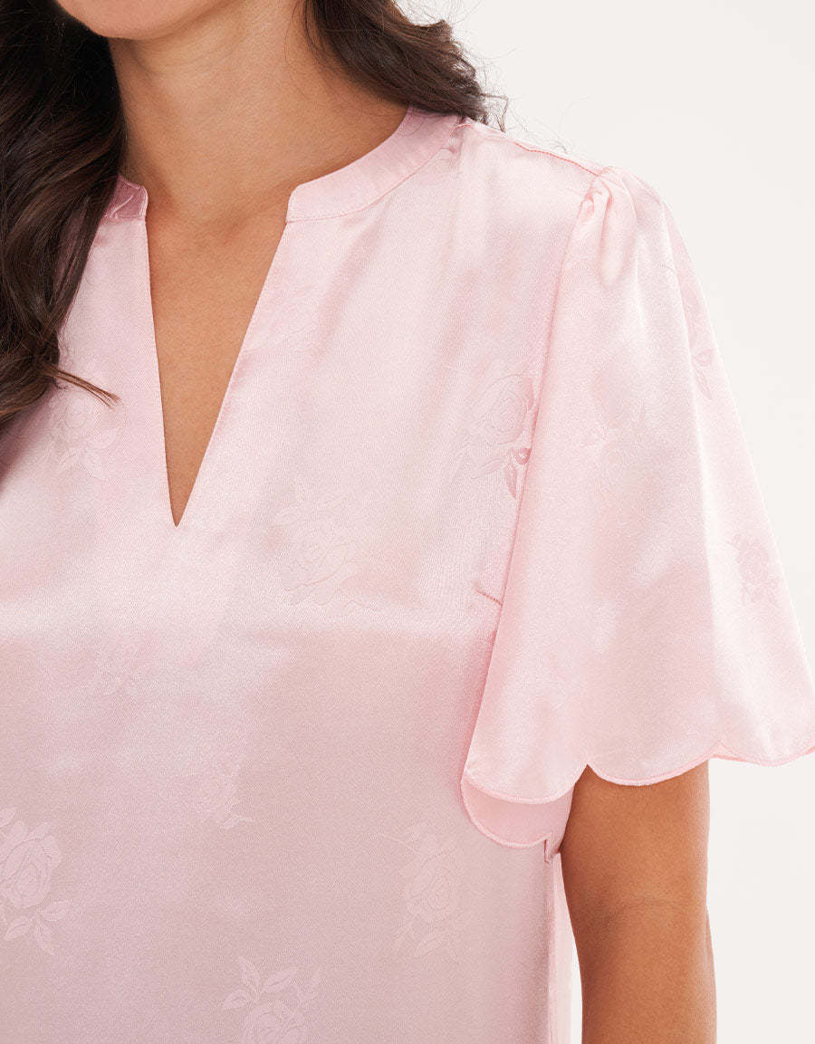 احتفلي برمضان بأناقة مع هذا القميص المنزلي المزهر باللون الوردي الفاتح. يتميز قماش الساتان الفاخر بانسيابية رائعة، ليمنحكِ إطلالة راقية، مثالية للتجمعات مع العائلة والأصدقاء.