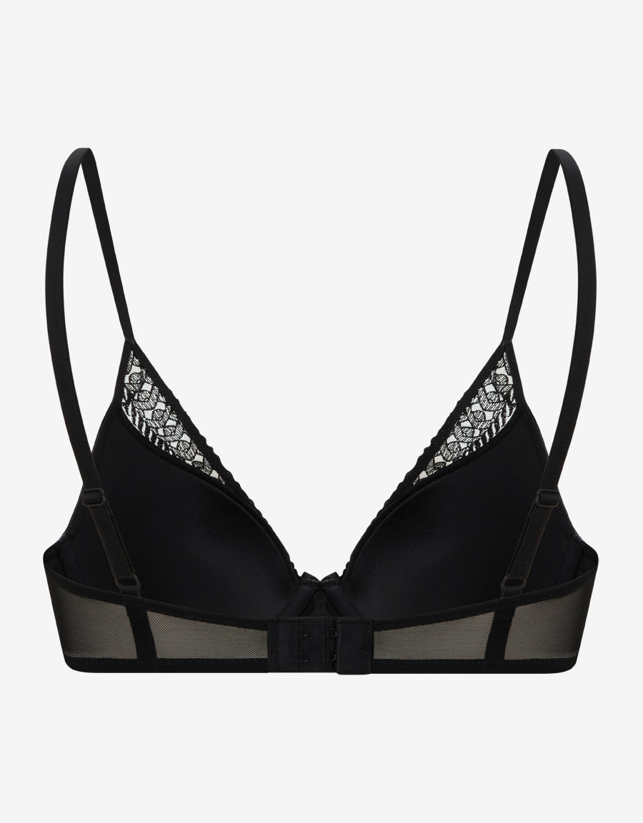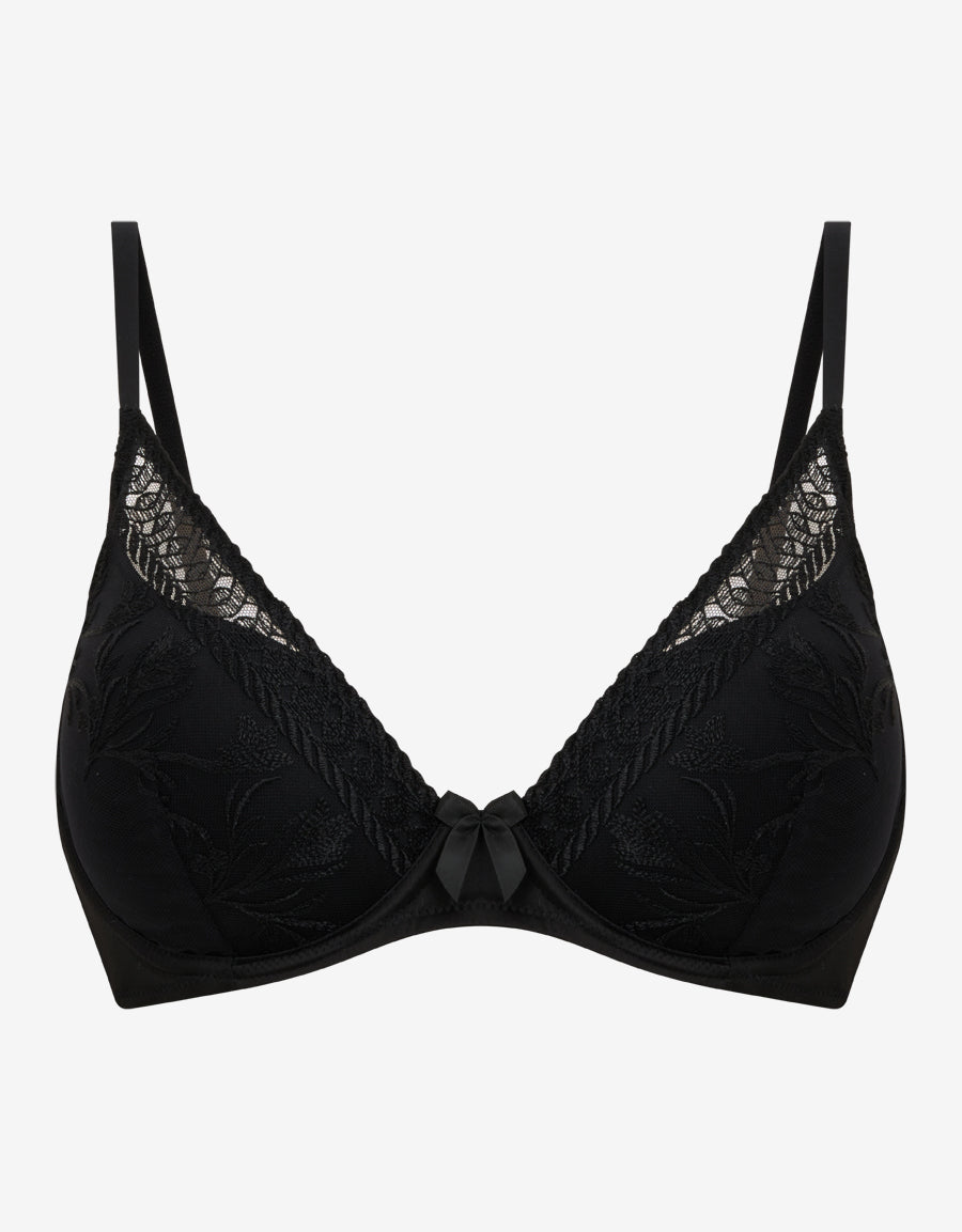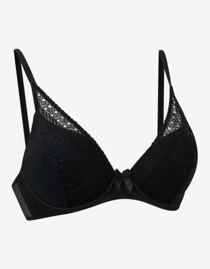 تجمع هذه الحمالة السوداء المطرزة بفتحة صدر عميقة بين التفاصيل الدقيقة والتصميم الأنيق بدون بوش أب. تصميمها المطرز الصلب يمنحك إطلالة راقية ودعماً لطيفاً مثالية للاستخدام اليومي.