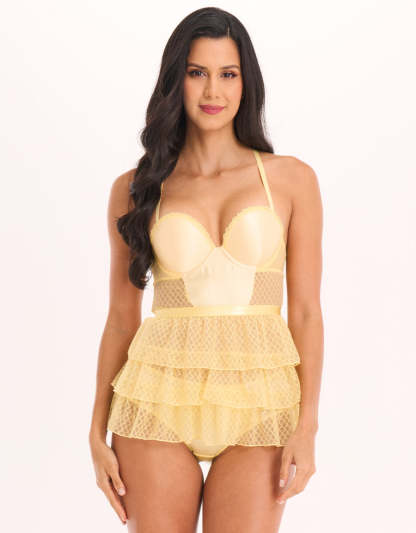 تألقي بالجاذبية في هذا البيبي دول باللون الأصفر الفاتح المصنوع من قماش شبكي رقيق. تمنحك الأنسجة الشفافة والتصميم الانسيابي لمسة مرحة ومنعشة لإطلالتك المسائية. مثالي عندما ترغبين في الشعور بالأناقة والجمال.