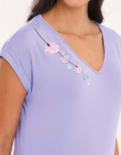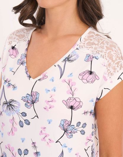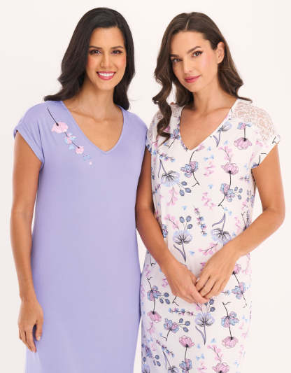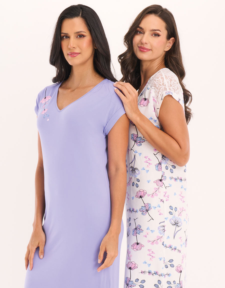 استمتعي بالراحة مع هذه العبوة المكونة من قطعتين: قميص نوم طويل بجيب منحني باللون الأرجواني مع طبعة زهور على الأكتاف، مرفق مع قميص نوم ناعم مزخرف بالزهور باللون الأبيض مع الدانتيل وفتحة رقبة مريحة على شكل حرف V. رفاهية مثالية للاسترخاء.