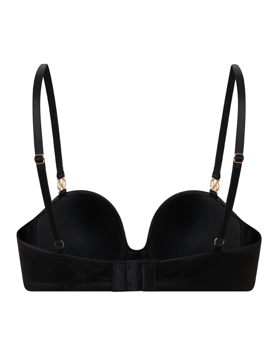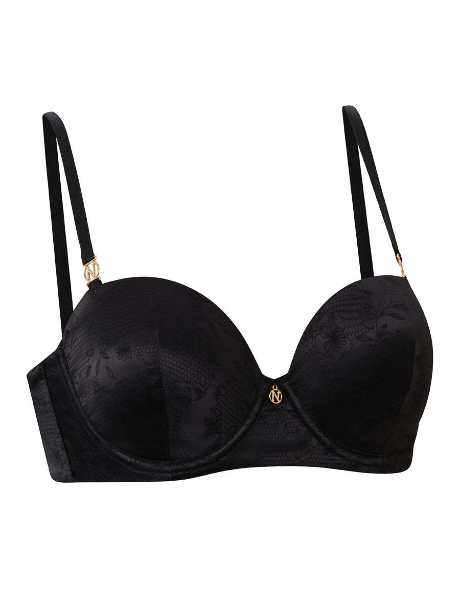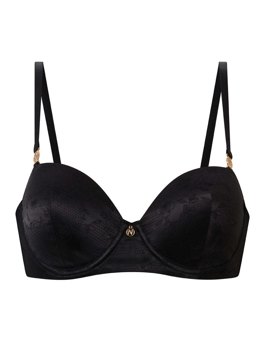حمالة صدر بالكونيت سوداء من ساتان جاكار بطبعة زهرية، تصميم بدون بوش أب يدمج الأناقة مع الراحة اليومية.