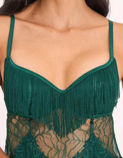 تألقي بإطلالة جريئة مع هذا البيبي دول الأخضر الداكن المزود بشراريب. مصمم ليتمايل مع كل خطوة، فهو مرح، جريء، ومميز — يجمع بين الحركة والغموض ودراما ليلية ناعمة.