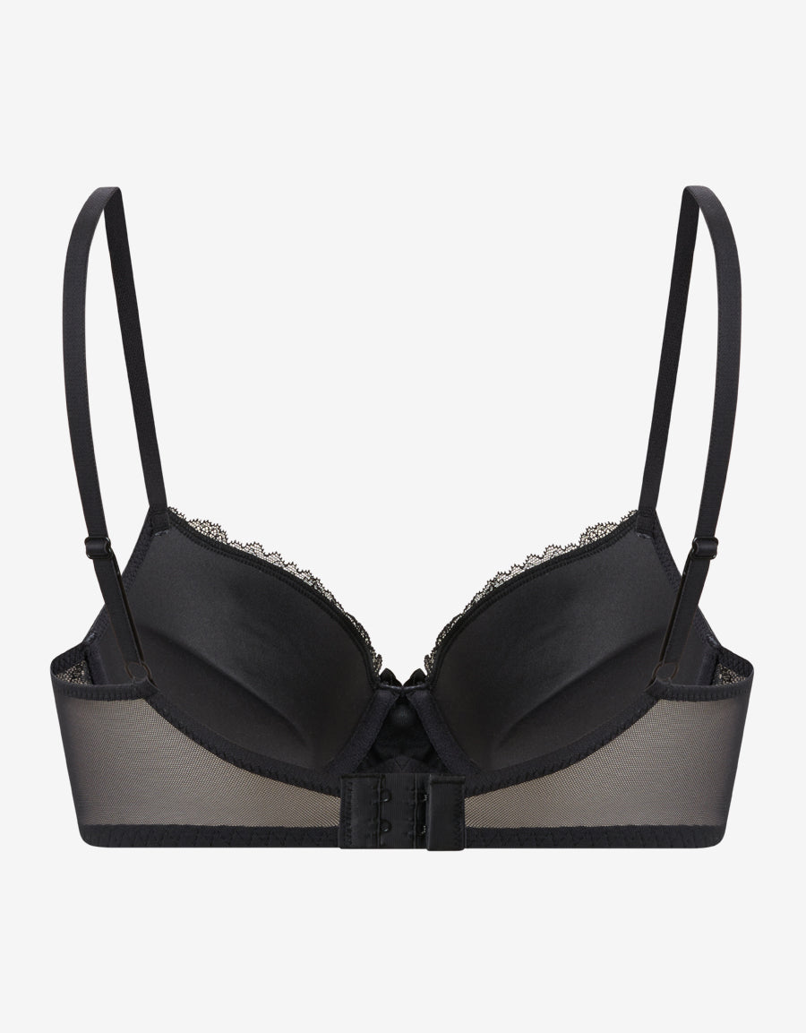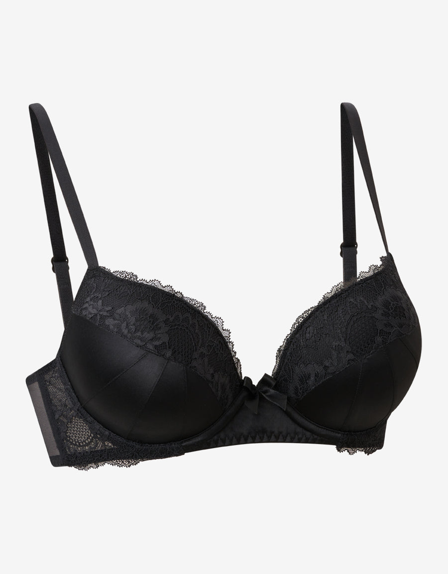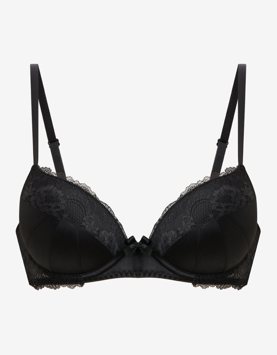 حمالة صدر بالكونيت من الساتان والدانتيل باللون الأسود، بتصميم دعم دفع يعزز الإطلالة مع لمسة نهائية ناعمة وأنيقة.