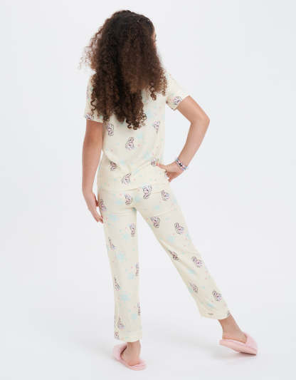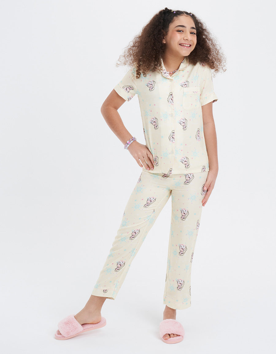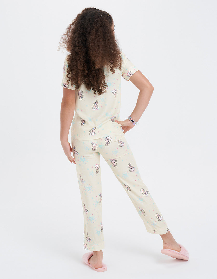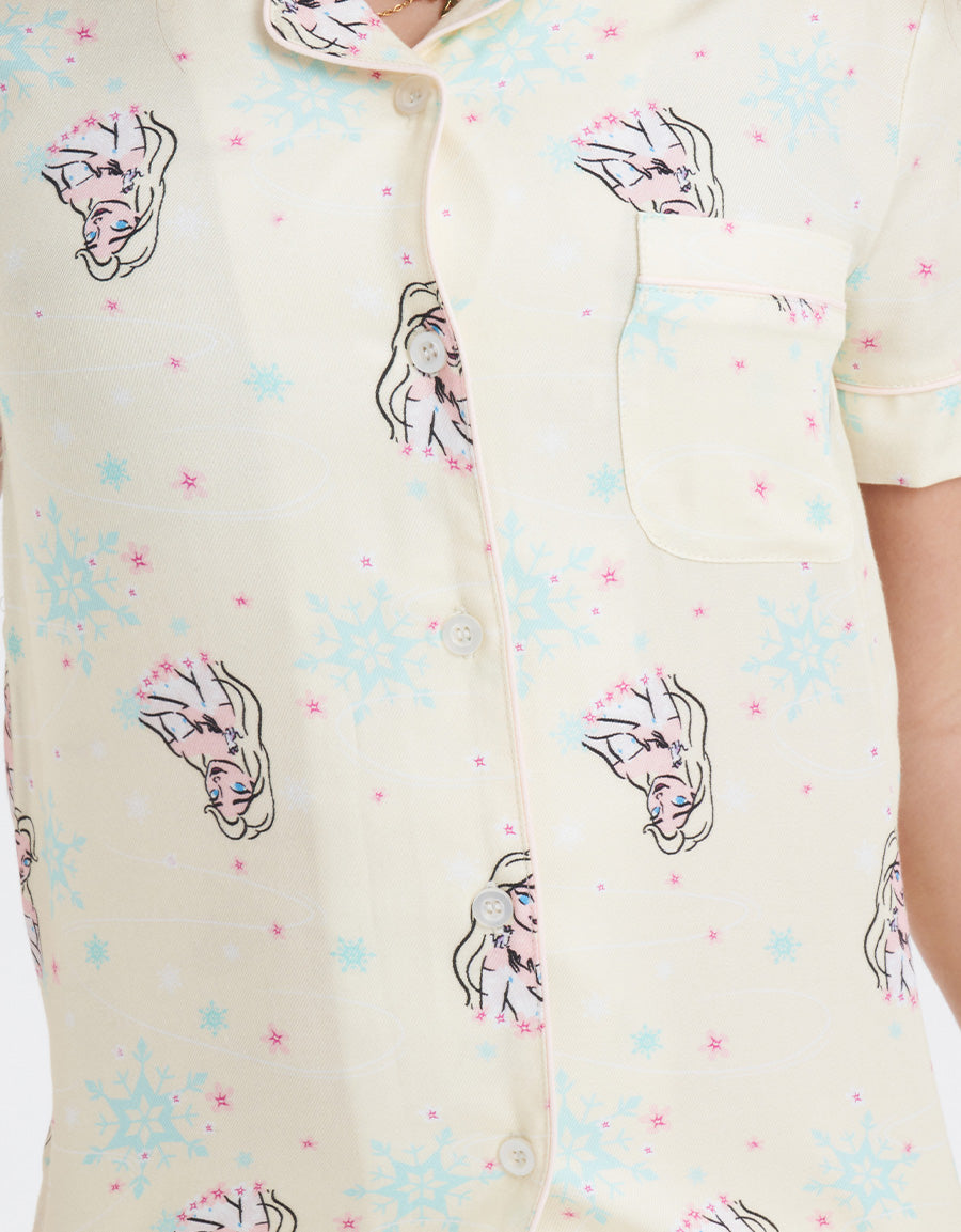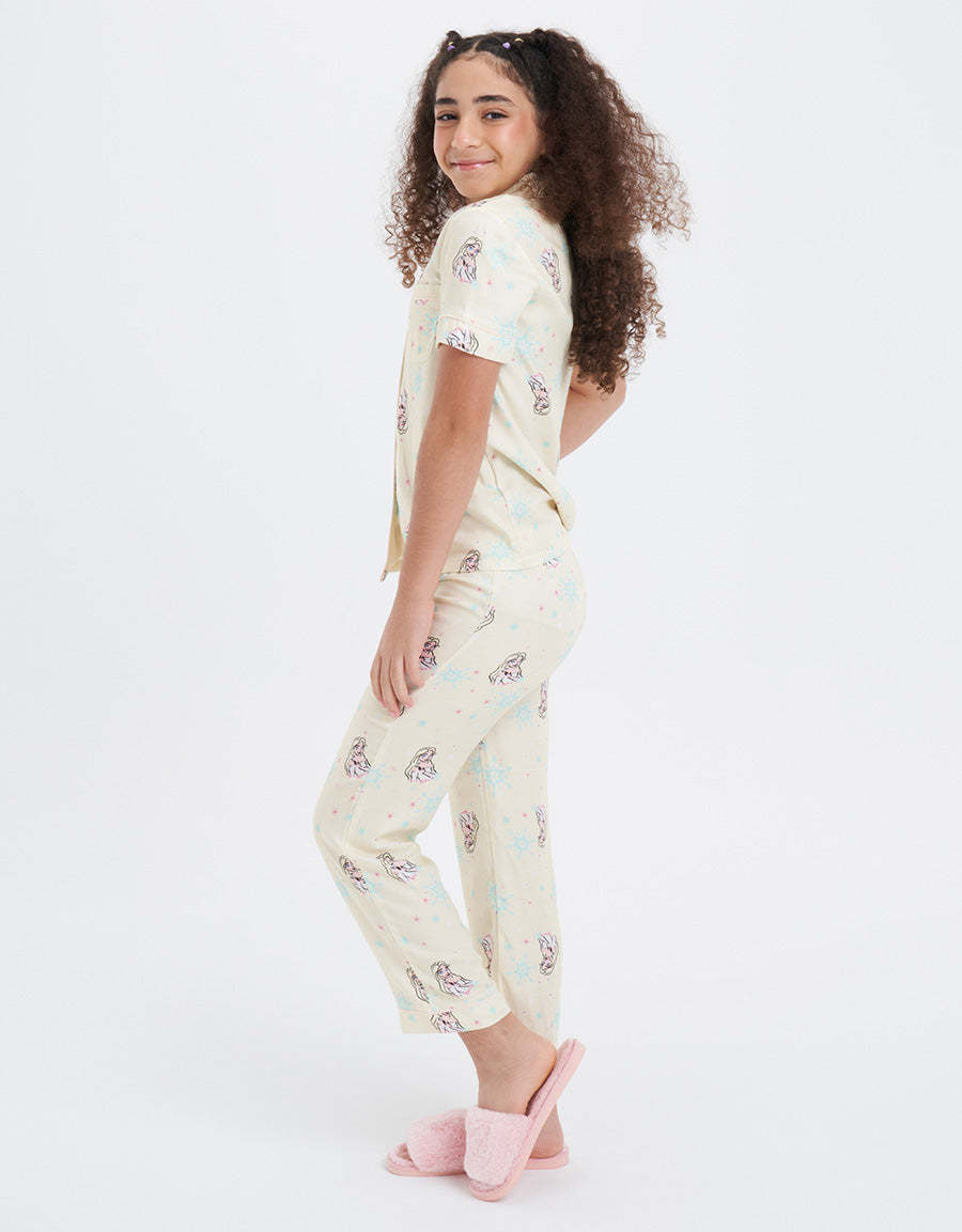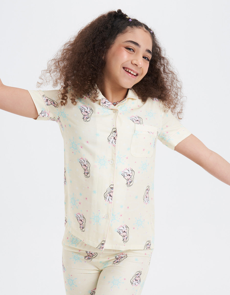طقم بيجاما فيسكوز تويل أخضر فاتح مع طباعة شخصية إلسا، مصمم للأميرات الصغيرات اللاتي يعشقن الليالي السحرية والأحلام المريحة. ناعم وسحري، مثالي لوقت النوم الممتع.