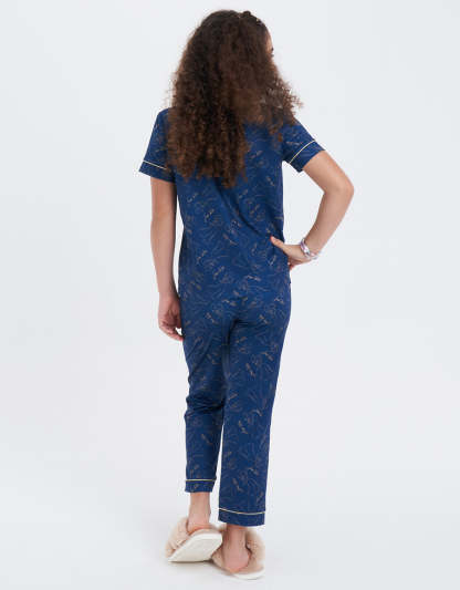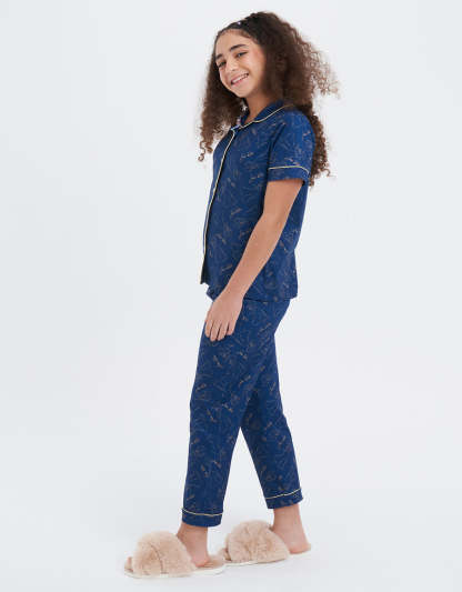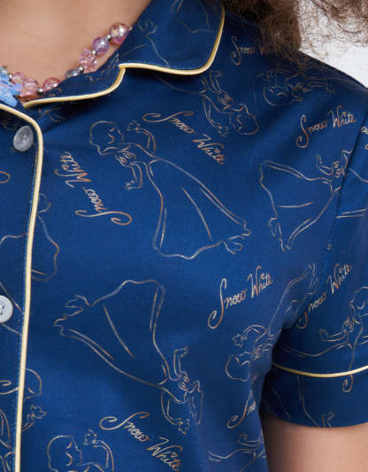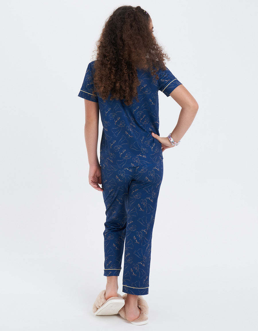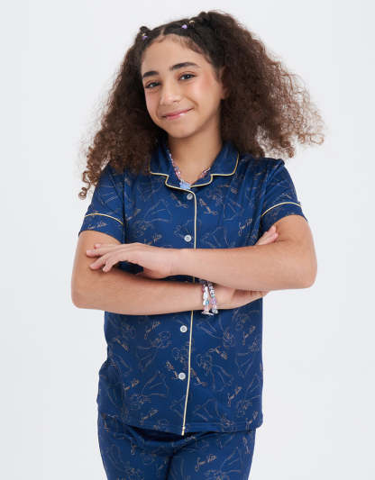 يتميز هذا الطقم الكلاسيكي من البيجاما باللون الأخضر الفاتح بطباعة شخصيات، وهو مصنوع من مزيج البولي رايون سباندكس، مما يجمع بين الأسلوب المرح والملمس الناعم المريح.