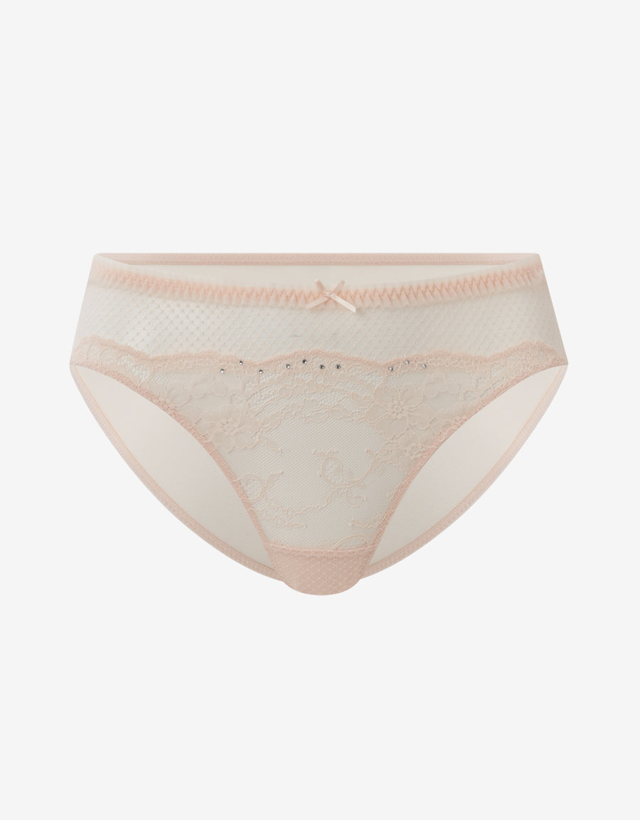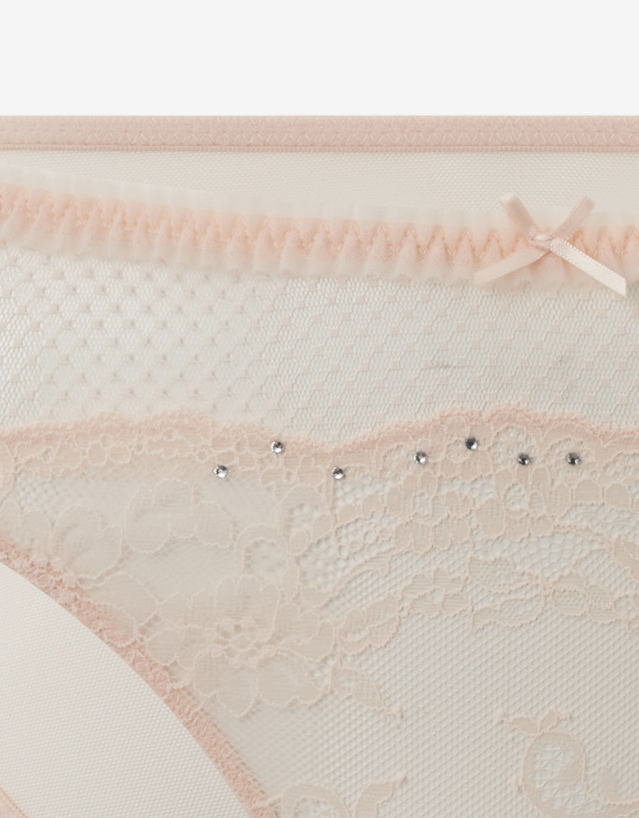 يجمع هذا البكيني بلون النيود الناعم بين الدانتيل الرومانسي والشبك الرقيق. خفيف الوزن وخالٍ من الخطوط، يعانق منحنياتك ليمنحك إطلالة مثالية في يومك المميز.