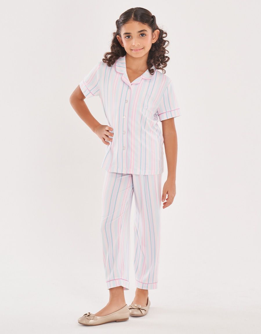 تقدم طقم البيجامة ذات الأكمام القصيرة، المصنوعة من البوليستر والإسباندكس الناعمة، اطلالة مرنة مع تصميم مخطط لأقصى درجات الراحة.