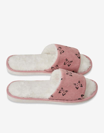 شباشب وردية مفتوحة من الأمام، مصنوعة من قماش جيرسي ناعم ومزينة بنقشة حيوانية، خيار أنيق ومريح لأيامك داخل المنزل.