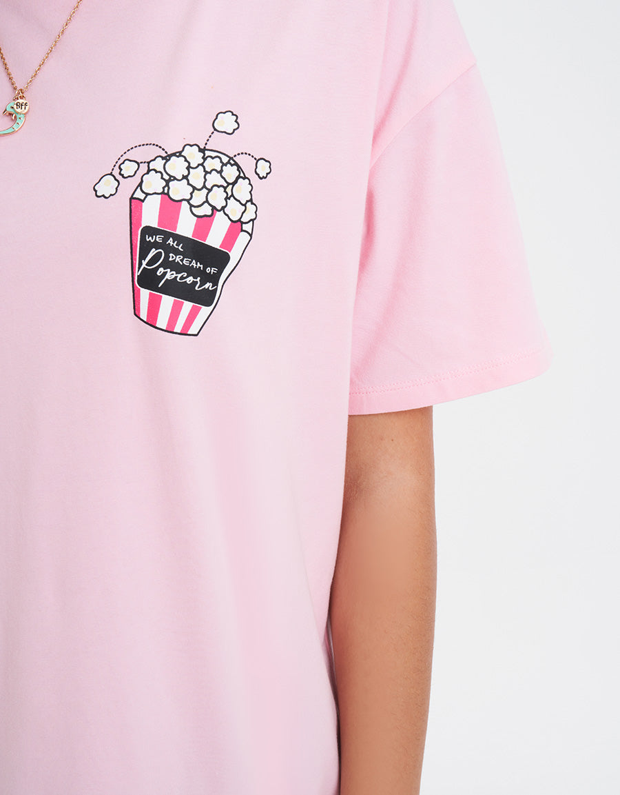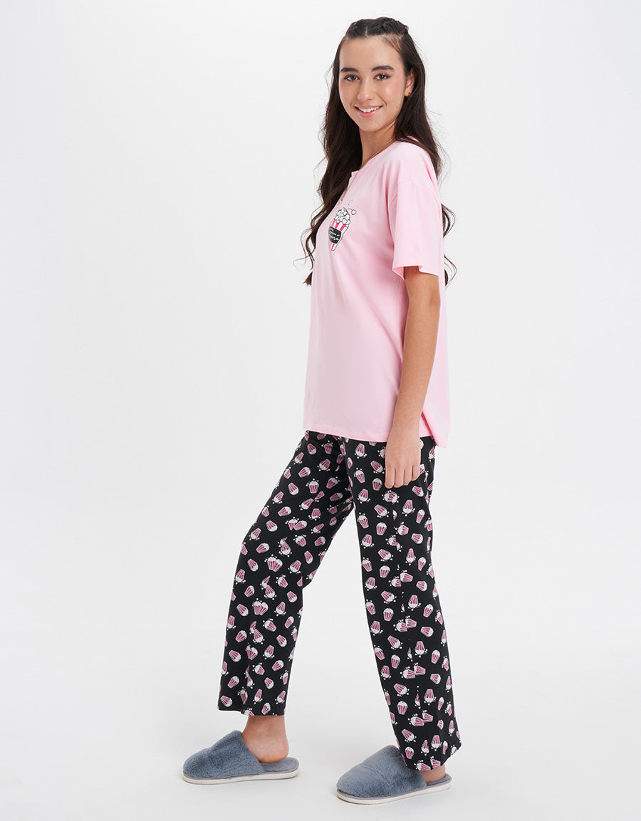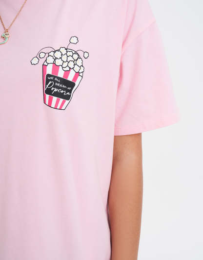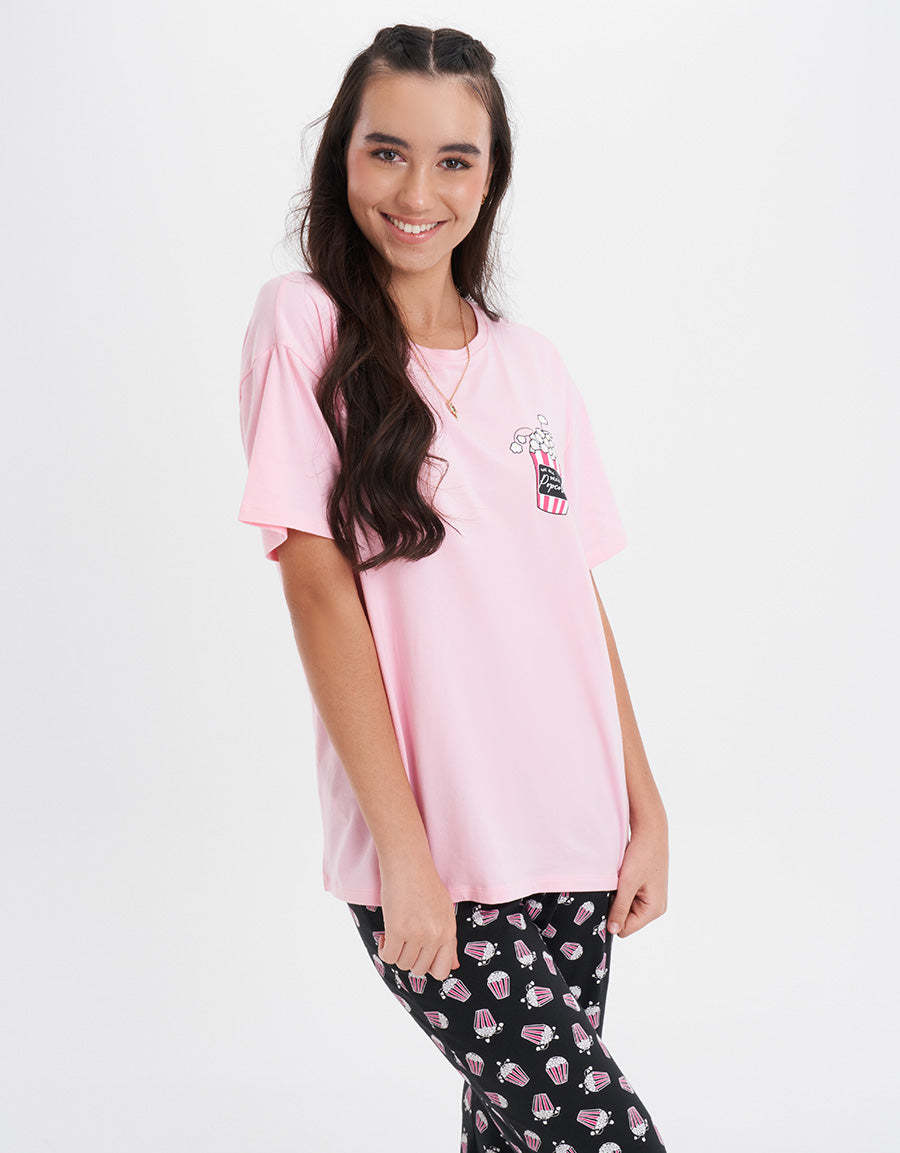 استرخي مع هذا الطقم البيجاما الممتع بتصميم طباعة الفشار! قماش ناعم واطلالة مريحة يجعلان منه الخيار المثالي لليالي الأفلام أو للاسترخاء في المنزل.