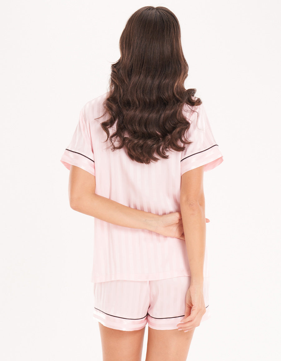 طقم بوكسر وردي فاتح بخطوط من ساتان جاكار، قماش ناعم بتصميم أنيق وراقي لنوم مريح.