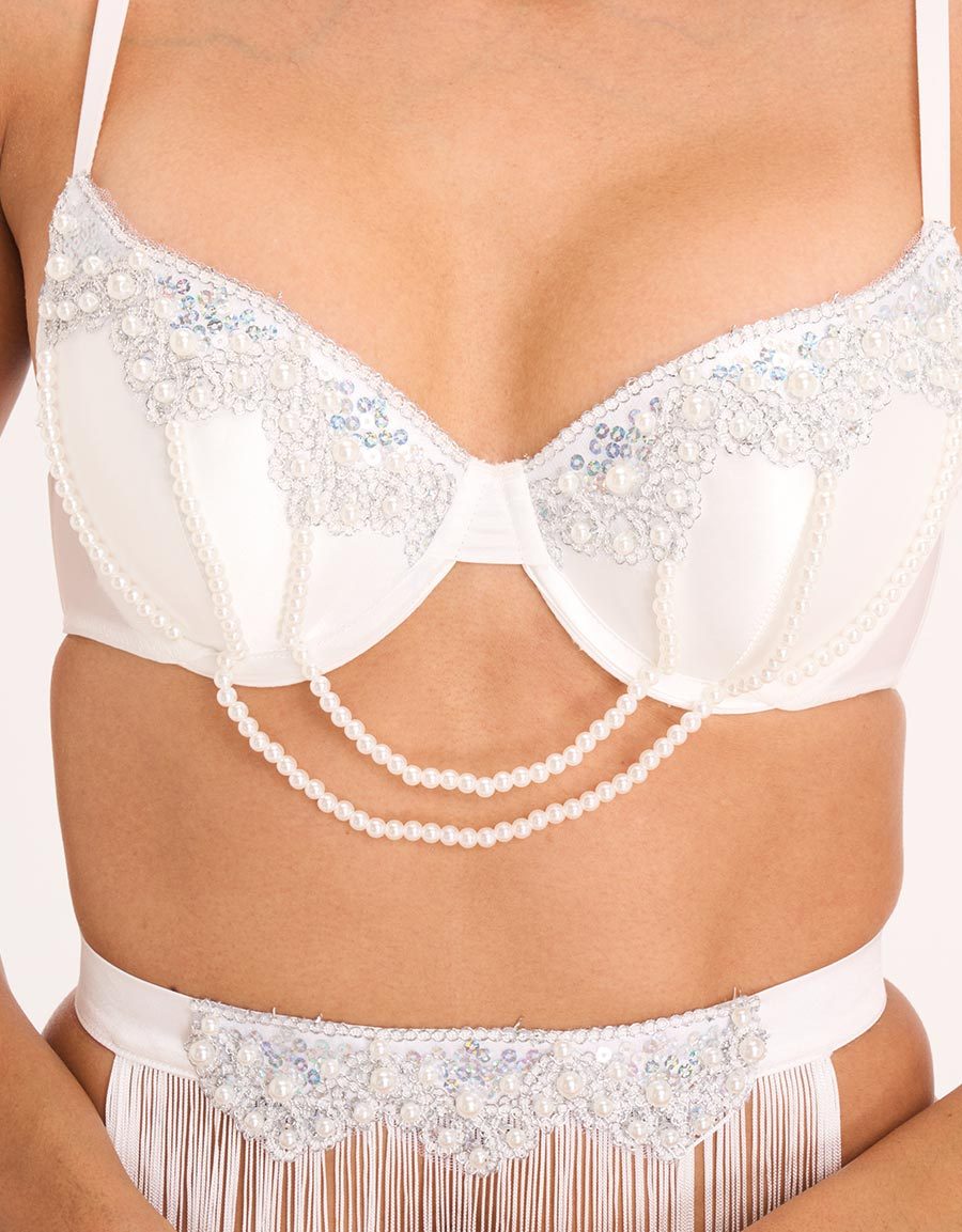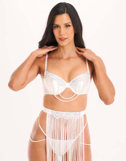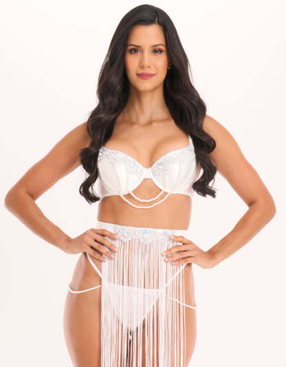 يتألق هذا الطقم الفاخر من الساتان الأبيض بتفاصيل من الترتر واللؤلؤ، ويكتمل بتنورة مزخرفة بالشراريب وتفاصيل لؤلؤة لإطلالة مغرية تلفت الأنظار.