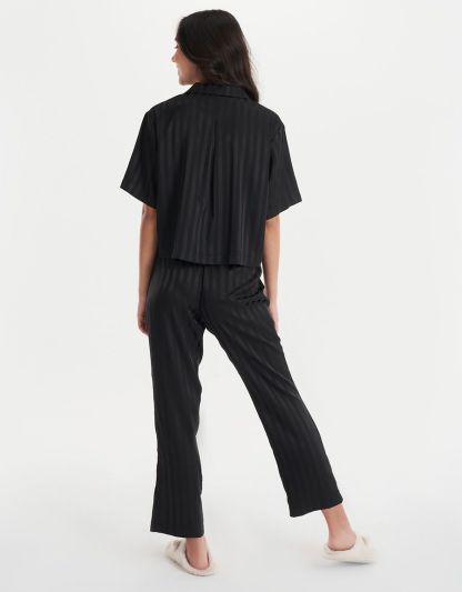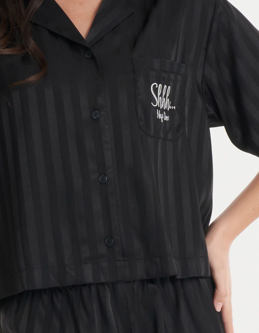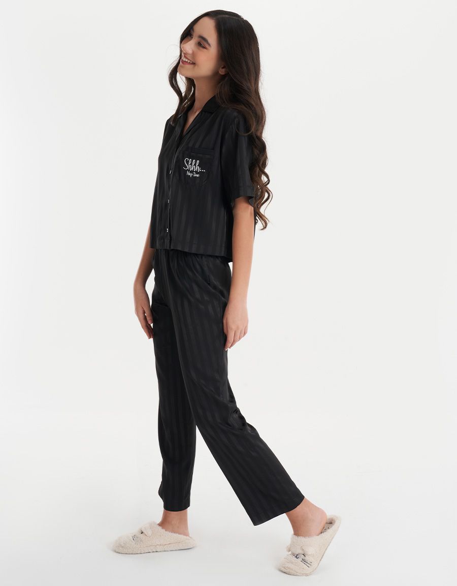تقديم مجموعة بيجاما الساتان السوداء المخططة - تجمع هذه المجموعة الأنيقة والراقية بين الراحة ولمسة من الأناقة الحديثة بسلاسة. مصنوعة من الساتان الأسود اللامع وزخارف بخطوط خفيفة، تم تصميم هذه المجموعة لأولئك الذين يقدرون الأناقة والاسترخاء.
