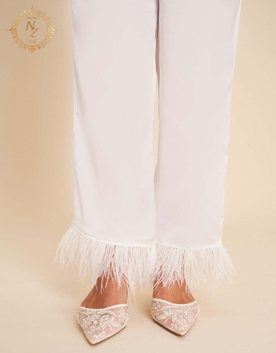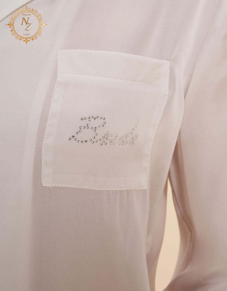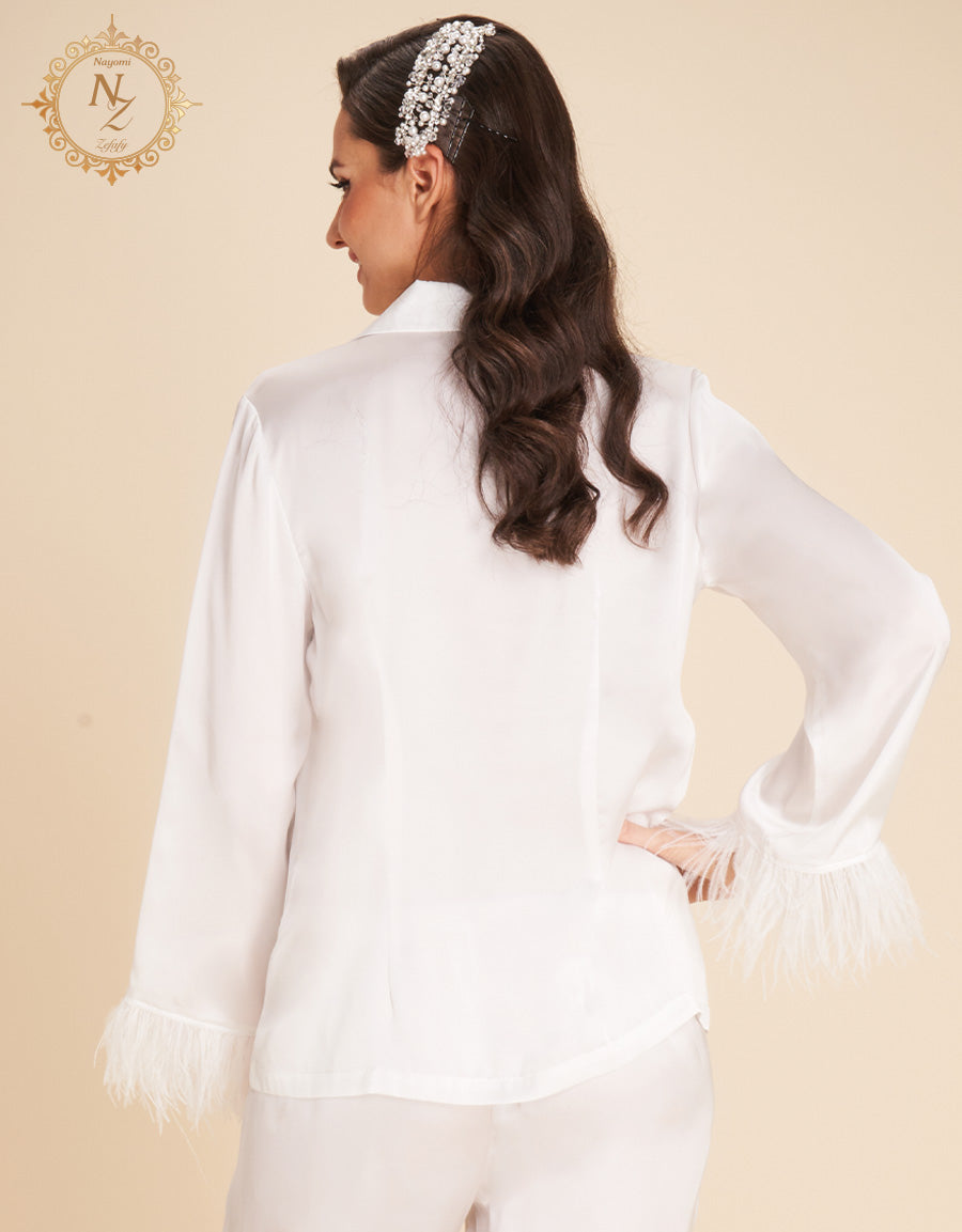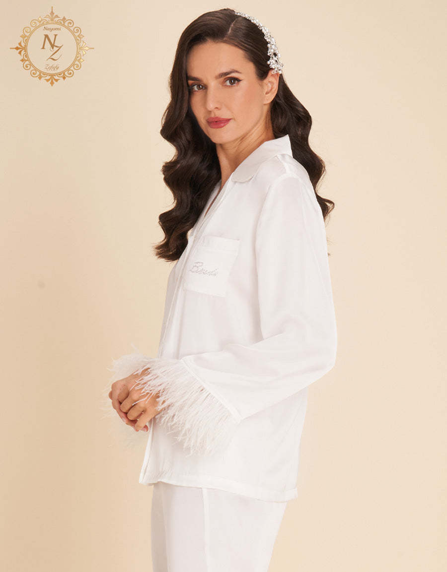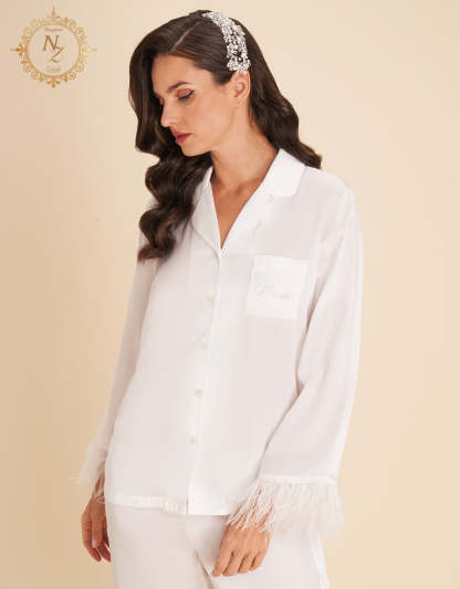 مصنوع من ساتان عاجي ناعم، هذا طقم النوم مثالي للعروس التي تبحث عن الأناقة والراحة معًا. القماش الفاخر يمنحك ليالي هادئة وصباحات مفعمة بالنعومة.