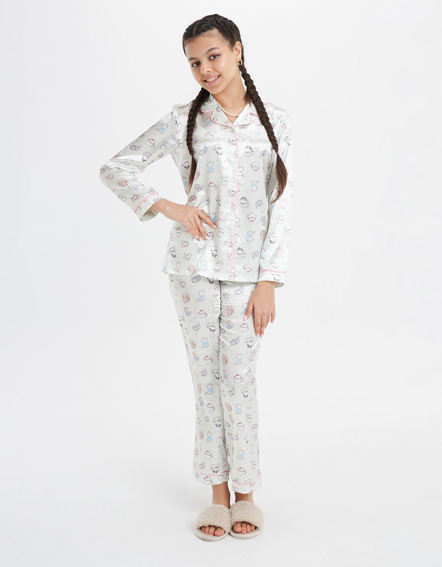 يقدم طقم البيجامة الكلاسيكي باللون الأخضر الفاتح المصنوع من الساتان، مع طبعة محادثة، اطلالة مريحة وأنيقة، مما يجعله مثاليًا لأولئك الذين يريدون الأناقة والمرح معًا.