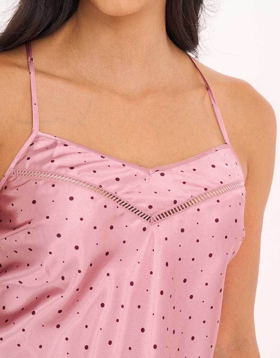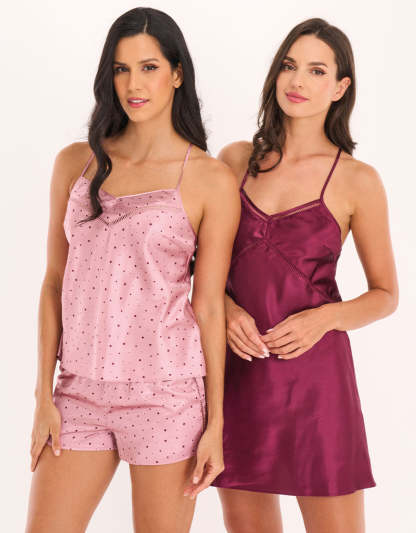 استمتعي براحة الساتان الحالمة مع قميص نوم قصير مزخرف بالدانتيل، وطقم بوكسر بنقوش النقاط، يتميز بحمالات قابلة للتعديل وظهر بتصميم متقاطع لاطلالة أنثوية مميزة.