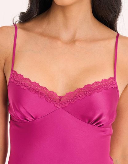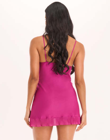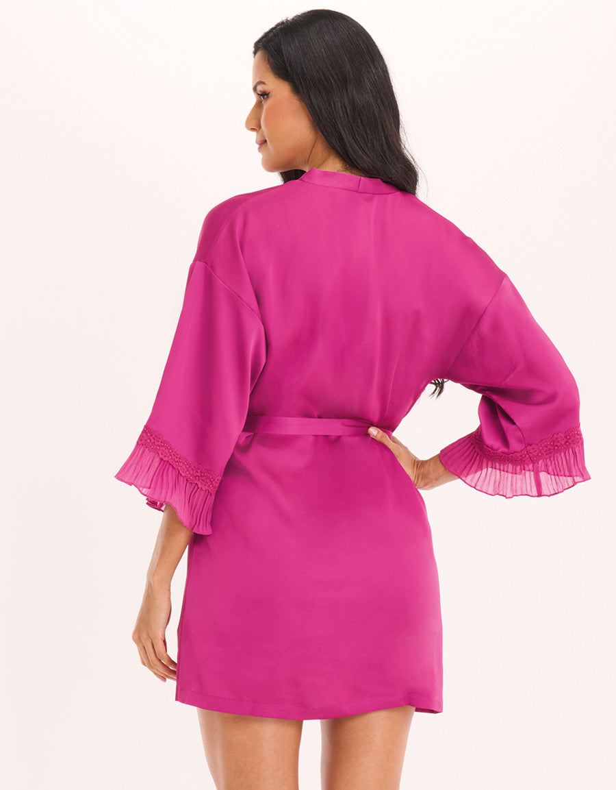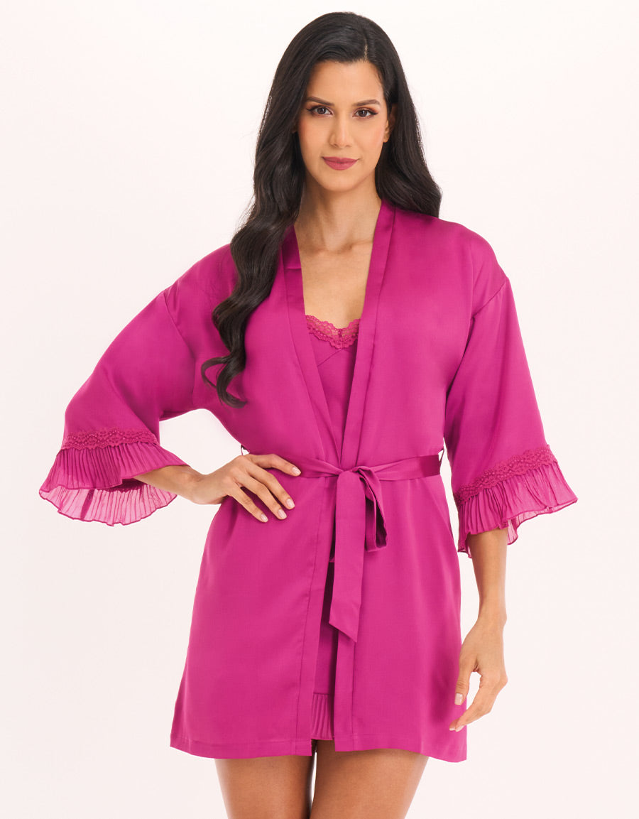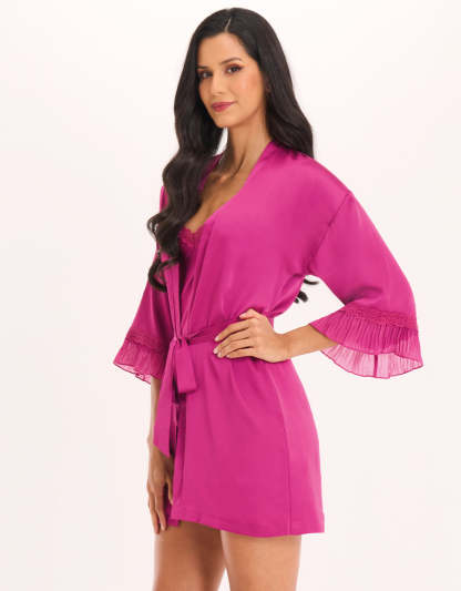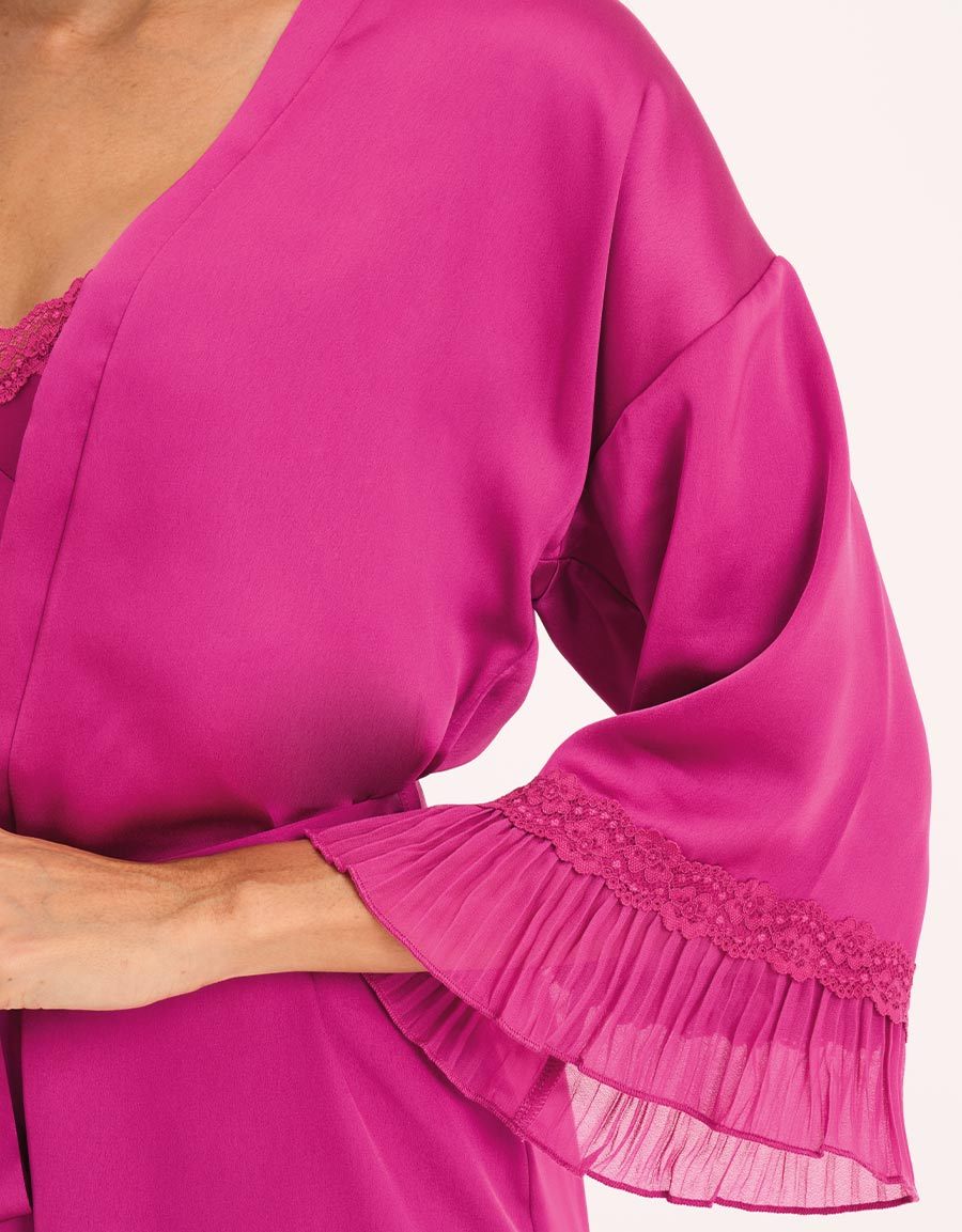 طقم قميص نوم قصير من الساتان الوردي الفوشيا يجمع بين الأناقة والراحة. يأتي مع قميص نوم وروب قصير متناسق، الخيار المثالي لمن يرغبن بالشعور بالجاذبية حتى في المنزل.