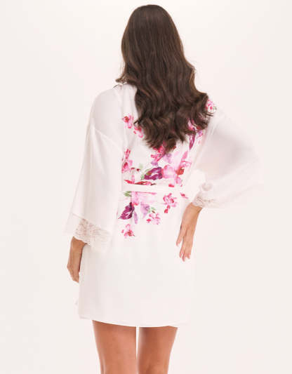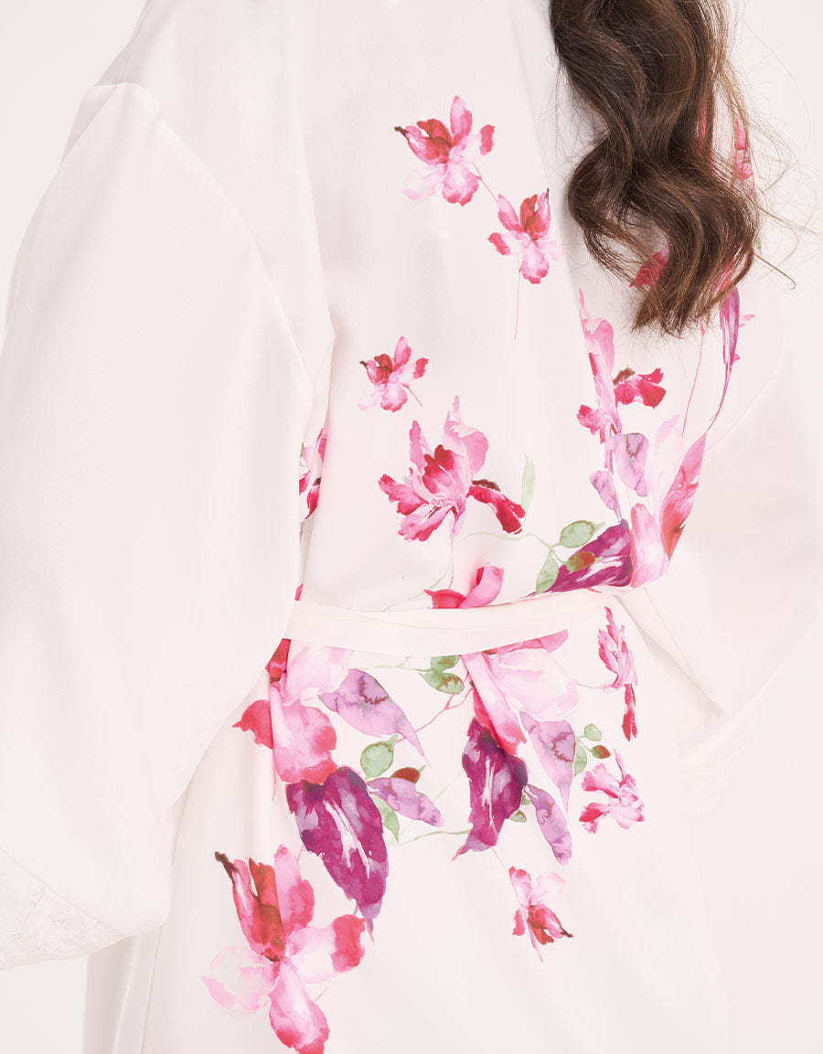 ارتقي بإطلالة نومك مع طقم قميص النوم القصير الأبيض بطبعات مميزة. يتضمن قميص نوم ساتان بطبعة فنية مع روب مطابق لإطلالة منسقة ومترفة.