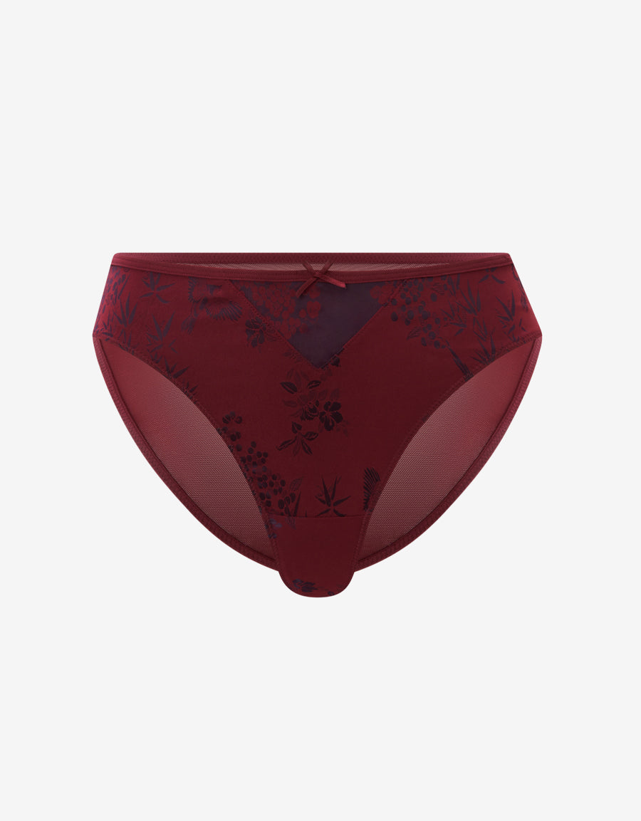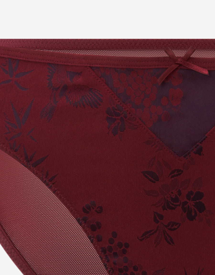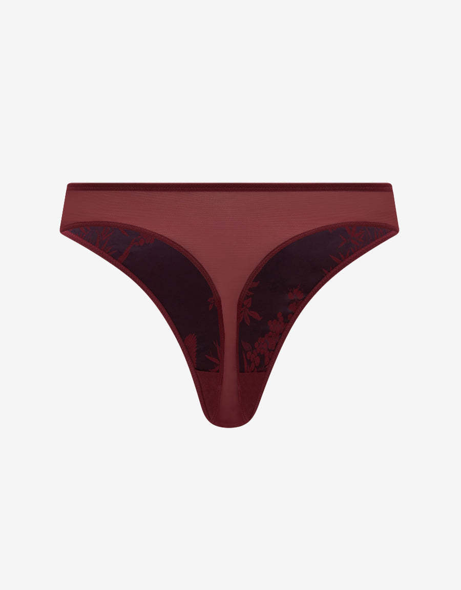 ثونغ ساتان مزين بنقشة زهرية بالكامل بألوان الأحمر والوردي الداكن، يجمع بين الأناقة والفخامة والراحة.