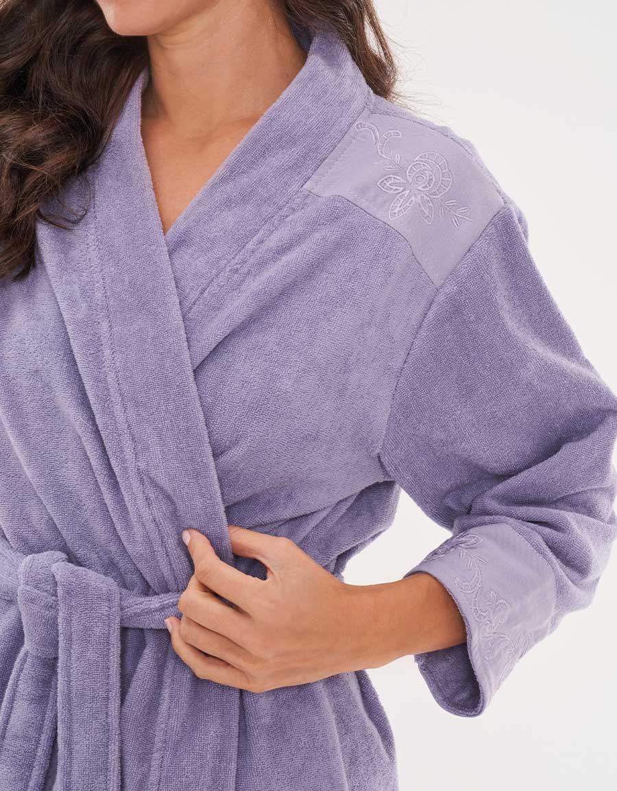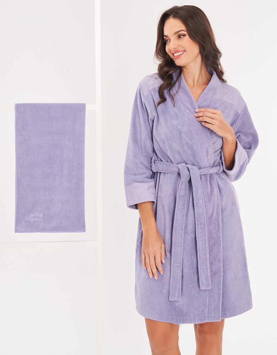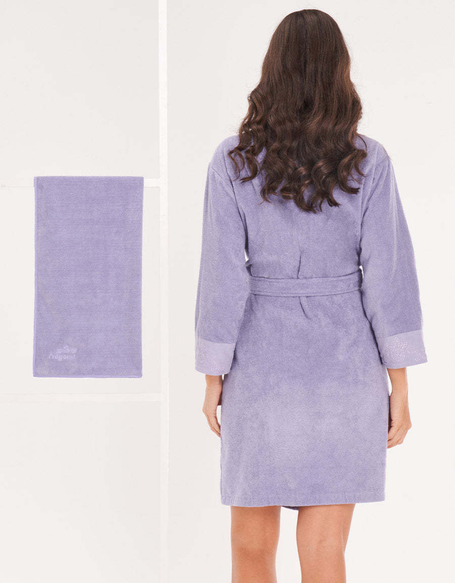 روب فاخر من تيري بتطريز أنيق على الأكتاف والأكمام. يأتي مع منشفة شعر متطابقة لتجربة سبا متكاملة. أنيق، ناعم، ومثالي للاسترخاء في الصيف.