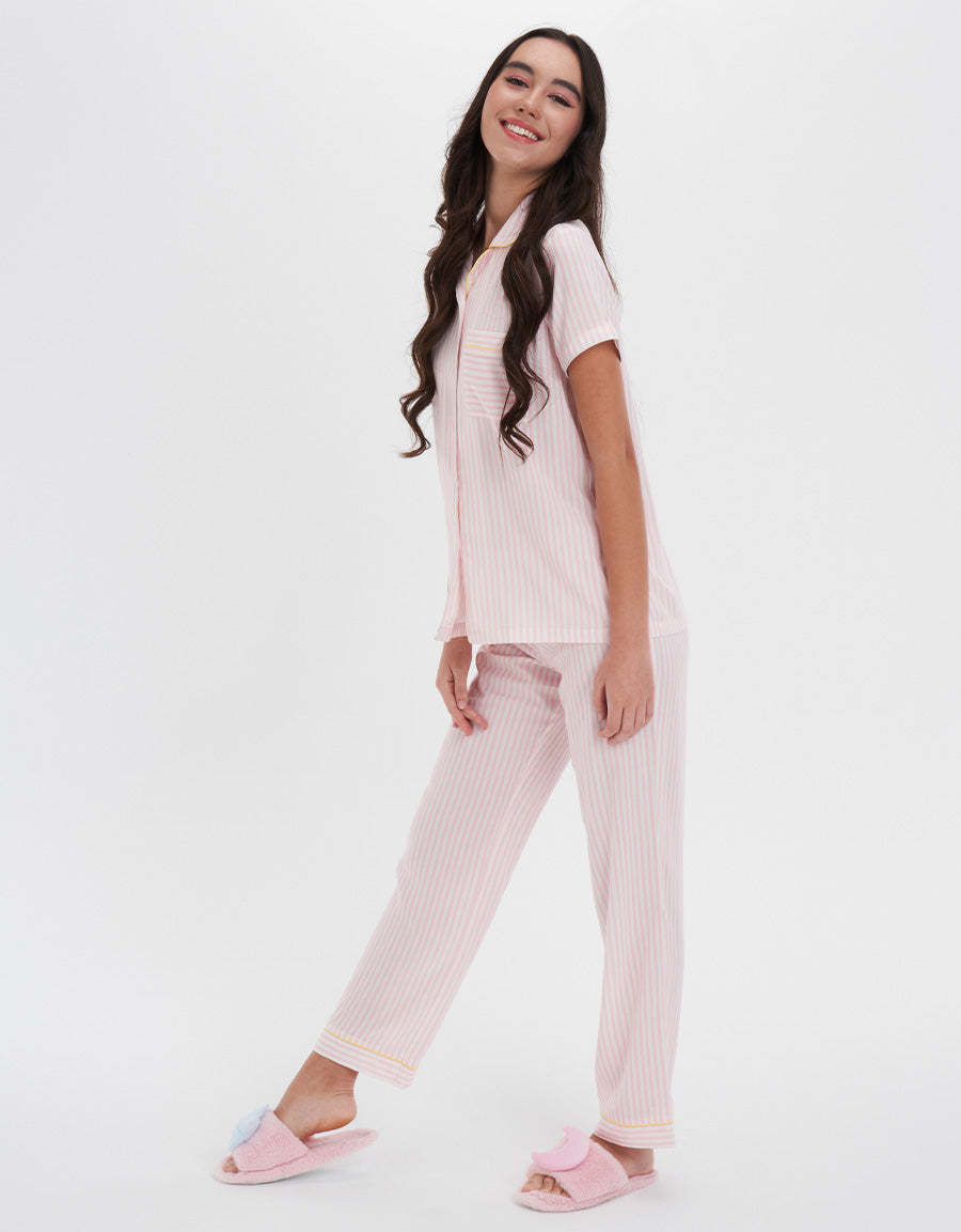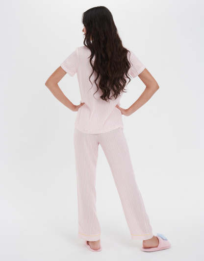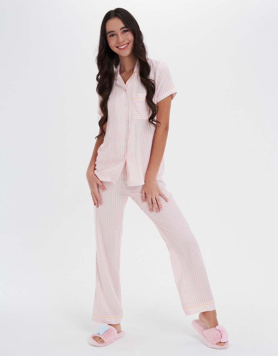 طقم بيجاما كلاسيكي وردي فاتح بأكمام قصيرة مع خطوط، مصنوع من قماش فيسكوز مسطح. مثالي للأميرات الصغيرات اللاتي يعشقن النوم المريح والمظهر الأنيق.