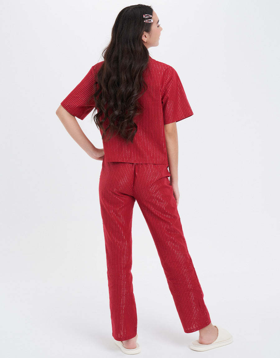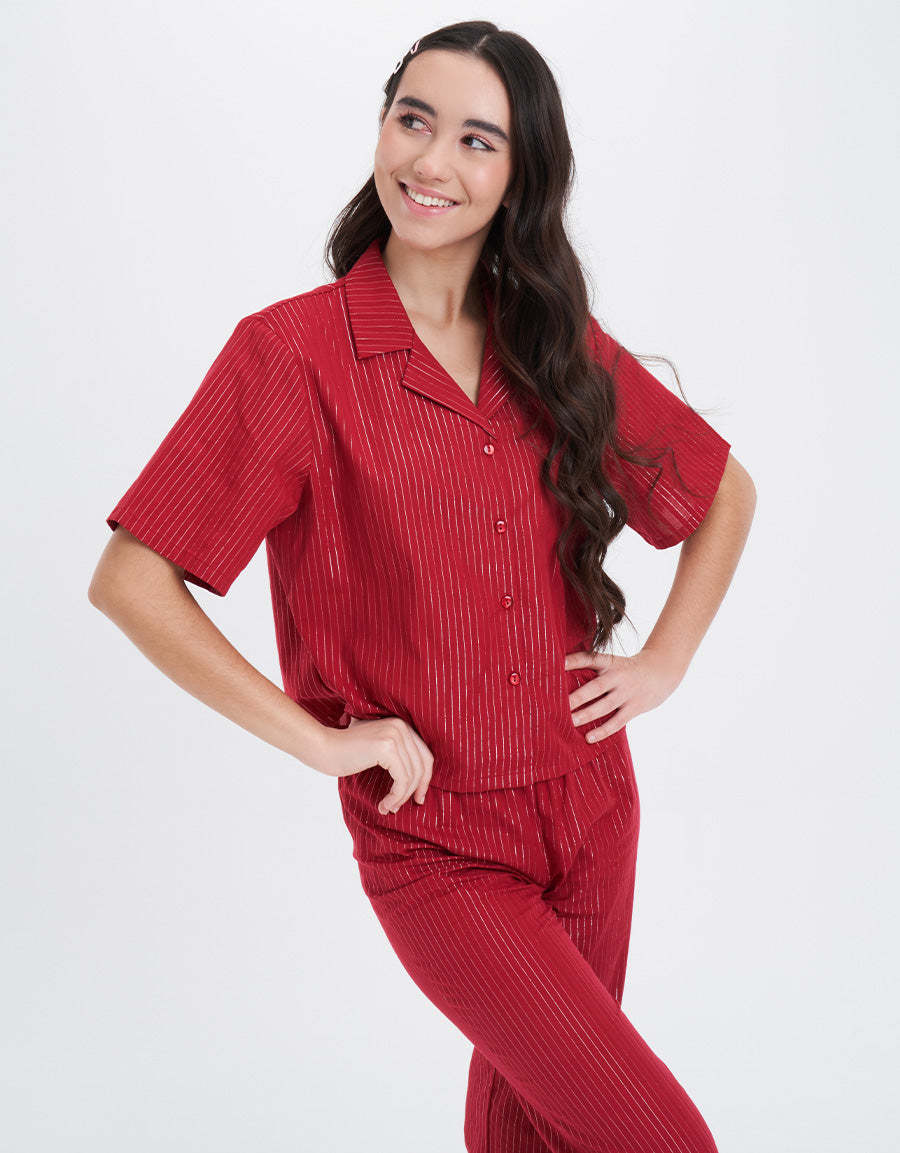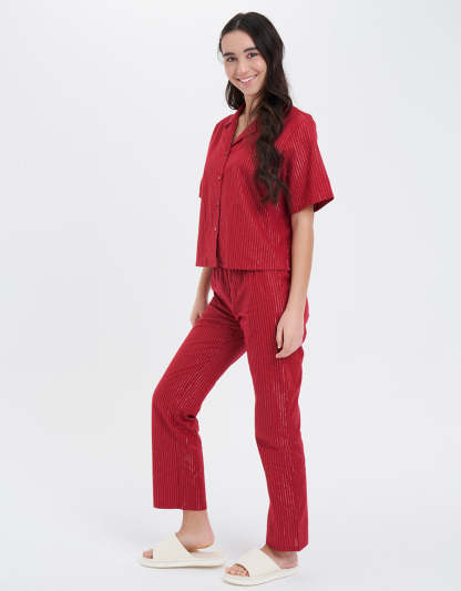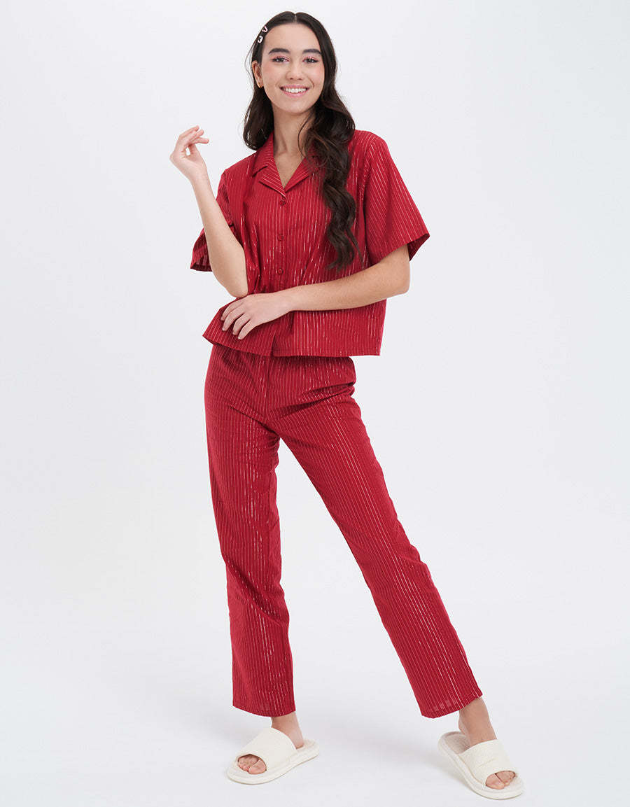 يتميز طقم البيجامة الكلاسيكي باللون الأحمر المصنوع من القطن بطبعة نجوم مرحة، مما يوفر لك تجربة نوم مريحة ومرحة مع لمسة جريئة من اللون.