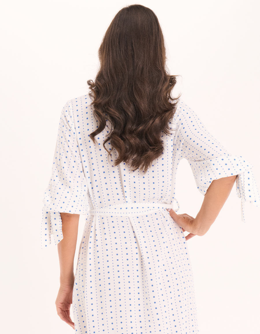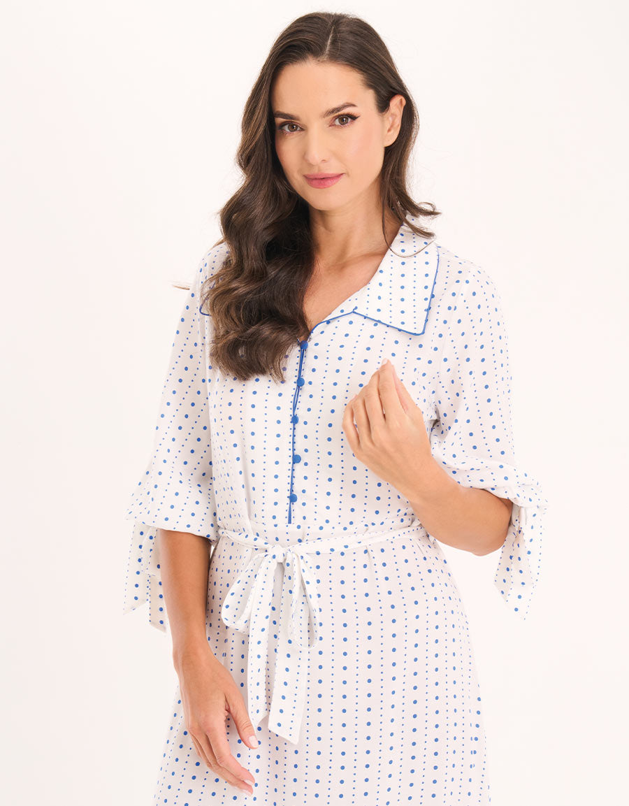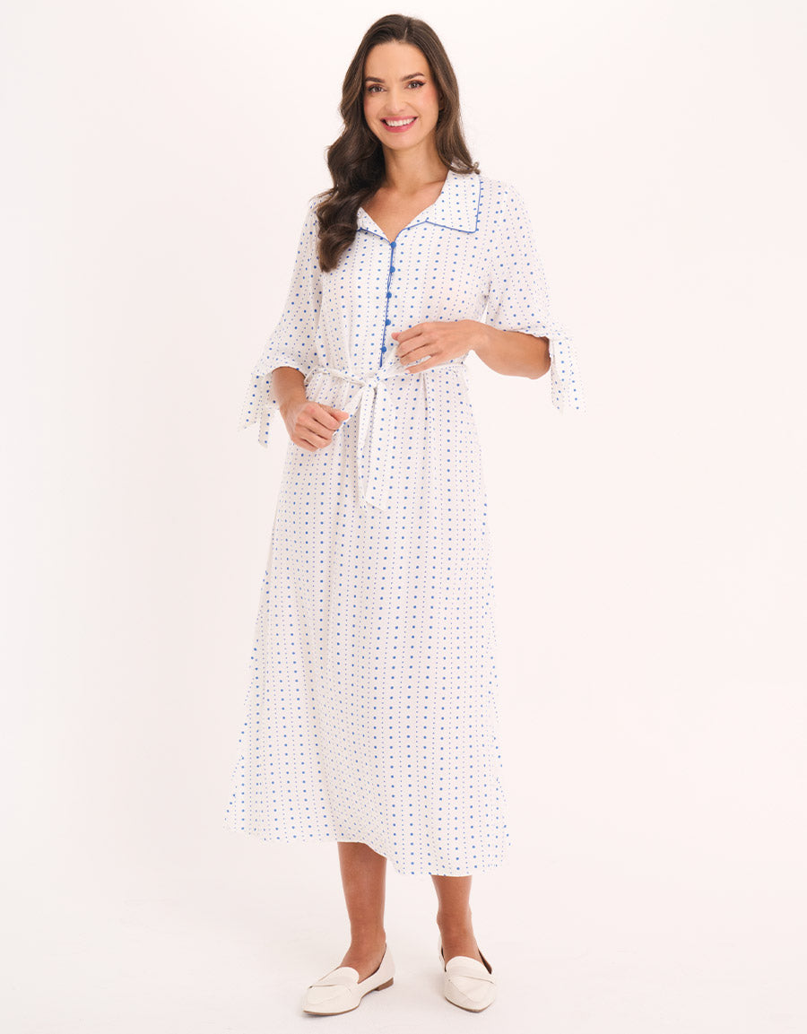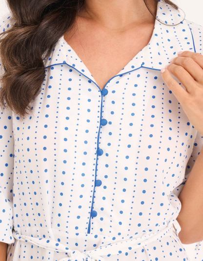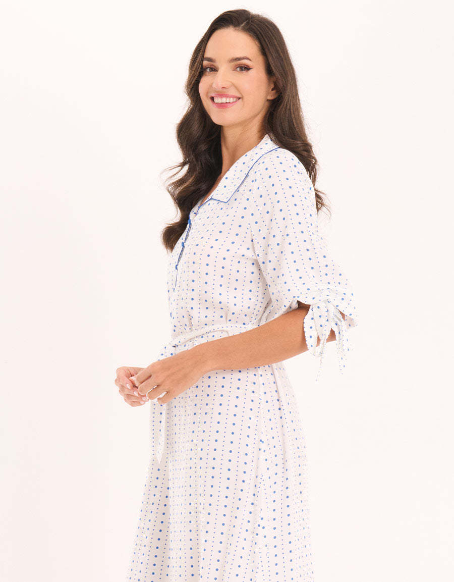 فستان نهاري مريح بنقشة منقطة باللون الأبيض، مصنوع من قماش فسكوز مسطح، يجمع بين الأناقة والراحة لمظهر يومي أنثوي مريح.